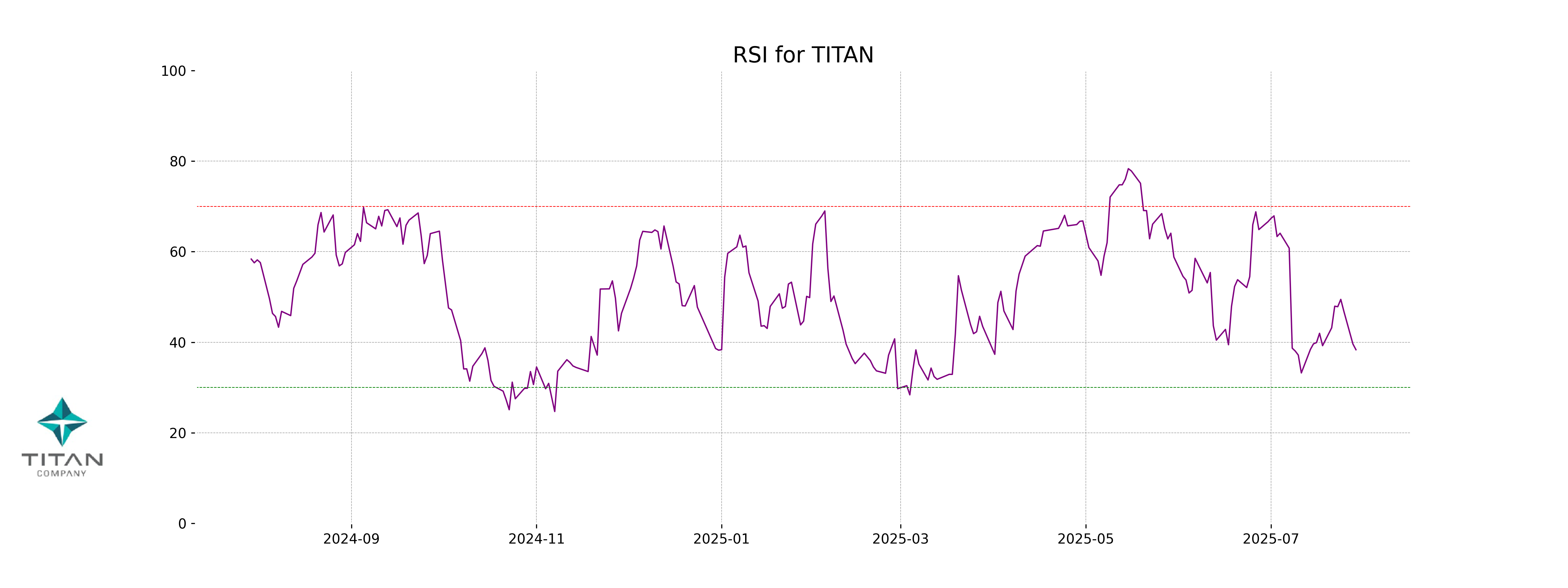 RSI Analysis for Titan Company: The Relative Strength Index (RSI) for Titan Company is 38.34, which suggests that the stock is approaching the oversold territory. This indicates potential for a price rebound, as RSI values below 30 typically suggest that a stock is undervalued.