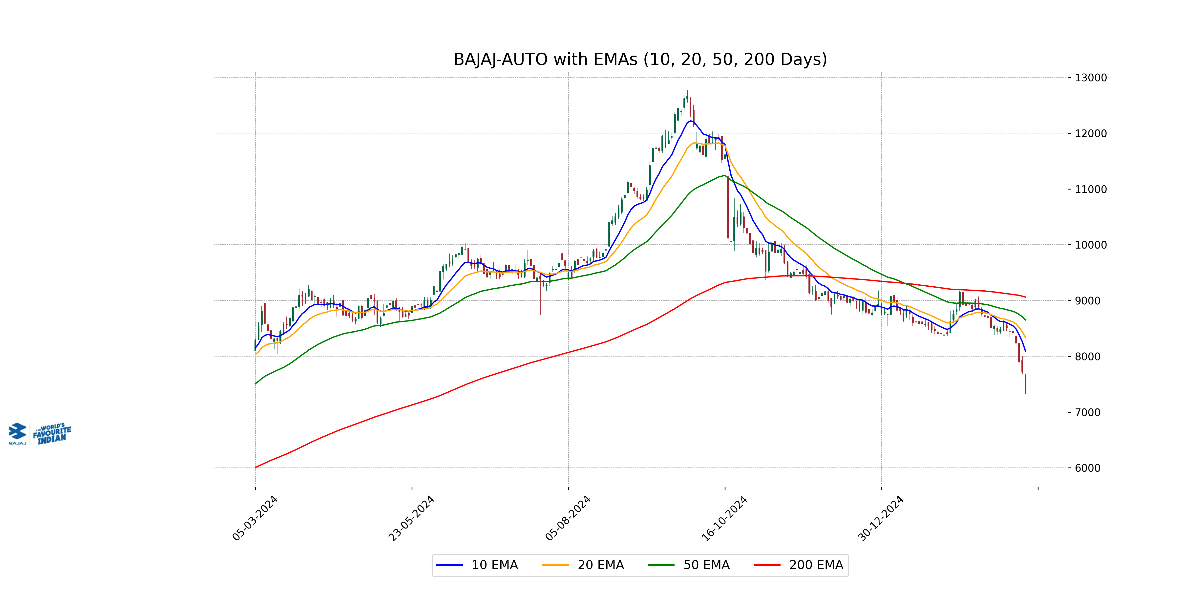 For Bajaj Auto, the current close price of 7333.30 is below key moving averages, with the 50-day EMA at 8654.07, the 200-day EMA at 9061.51, and the 20-day EMA at 8334.06, indicating a bearish trend. Additionally, the 10-day EMA stands at 8092.45, further emphasizing that the stock is trading below short-term averages.