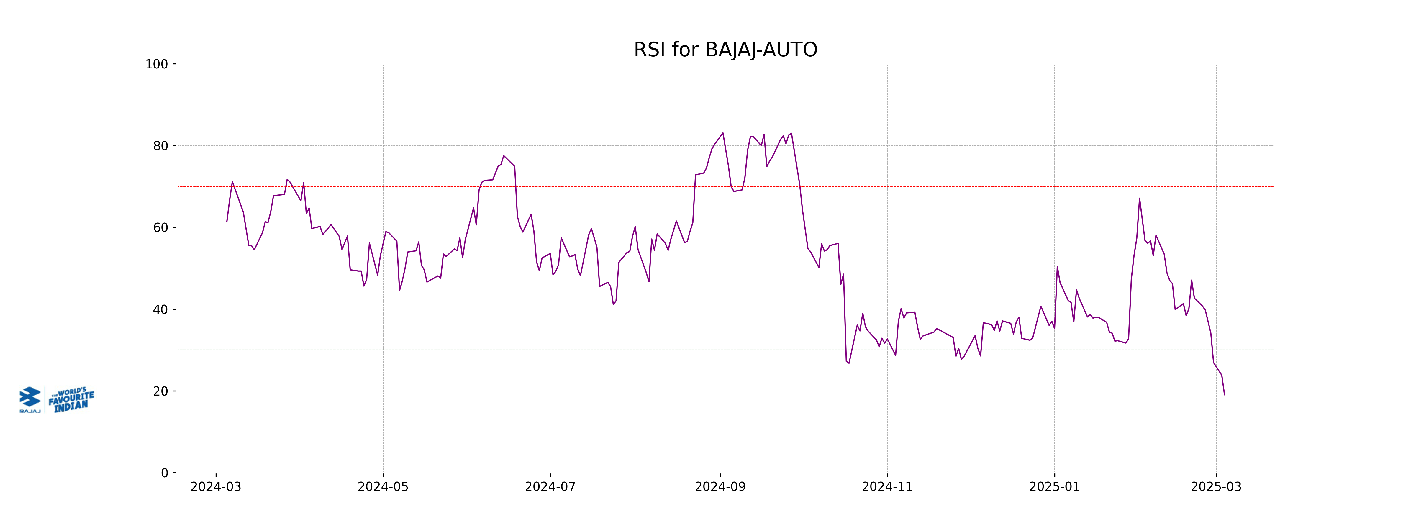 RSI Analysis for Bajaj Auto: The Relative Strength Index (RSI) for Bajaj Auto is currently at 19.03, indicating an oversold condition as it is below 30. This suggests that the stock may be undervalued in the short term, and a potential reversal or upward movement might be anticipated.