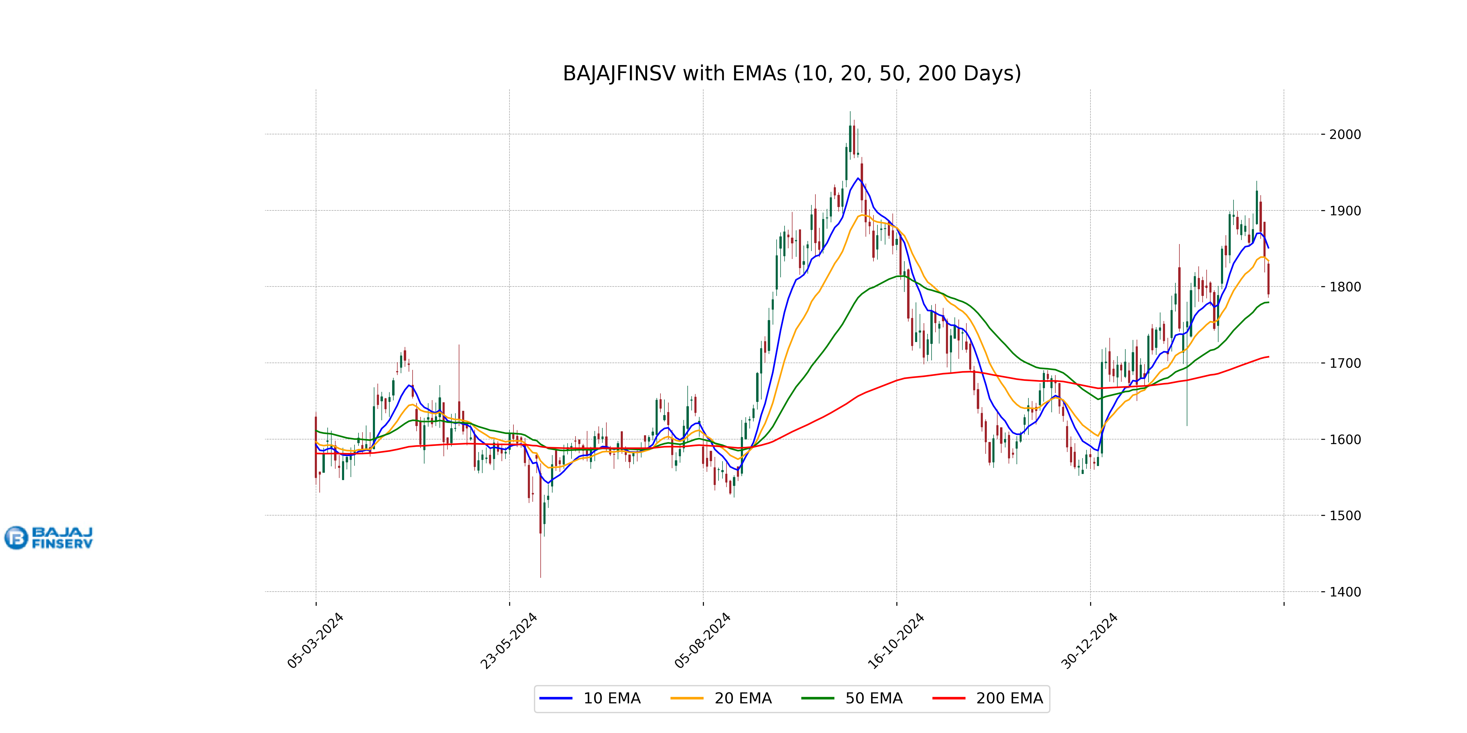 Bajaj Finserv's current close of 1790.3 is above its 50-day EMA of 1779.31 but below its 10-day EMA of 1850.93 and 20-day EMA of 1834.05, indicating recent bearish momentum. The stock is still above its long-term 200-day EMA of 1707.91, suggesting overall strength in the longer term despite short-term weakness.