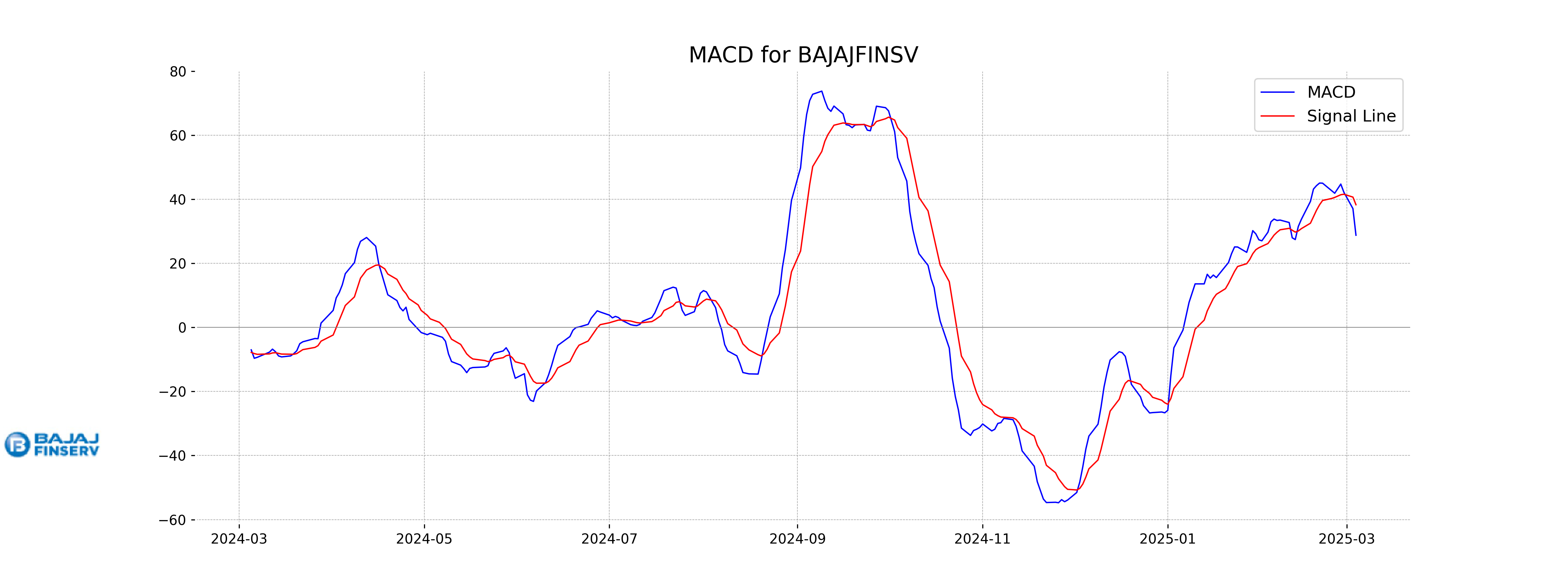 Bajaj Finserv's MACD line is currently at 28.77, which is below its MACD Signal line at 38.29. This indicates a bearish signal, suggesting potential downward momentum in the short term. The RSI of 46.16 also suggests that the stock is neither overbought nor oversold.