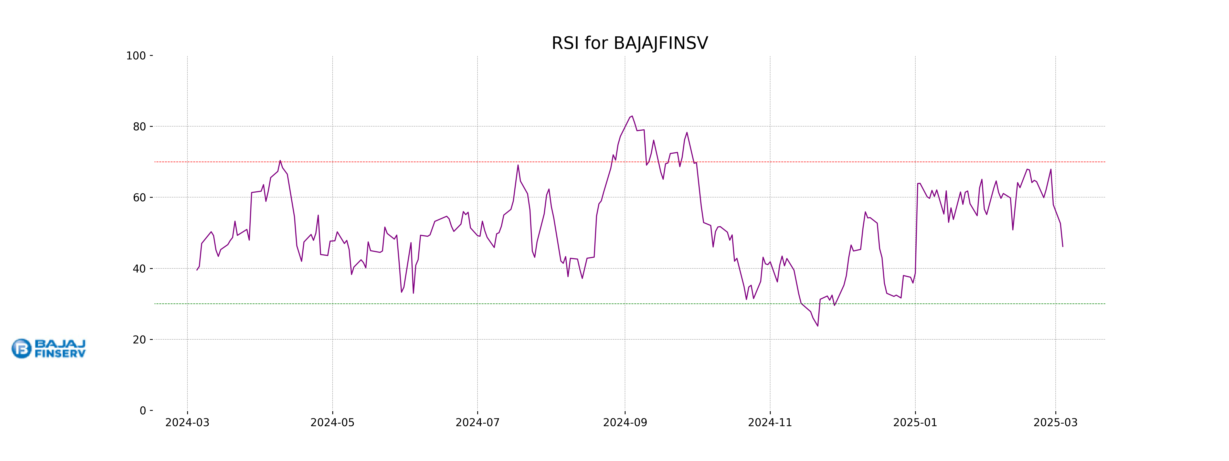 RSI Analysis for Bajaj Finserv: The Relative Strength Index (RSI) for Bajaj Finserv is 46.16, which indicates that the stock is in the neutral zone and neither overbought nor oversold. Typically, an RSI below 30 suggests oversold conditions, while above 70 suggests overbought conditions. Hence, Bajaj Finserv's RSI suggests a balance in buying and selling pressures.