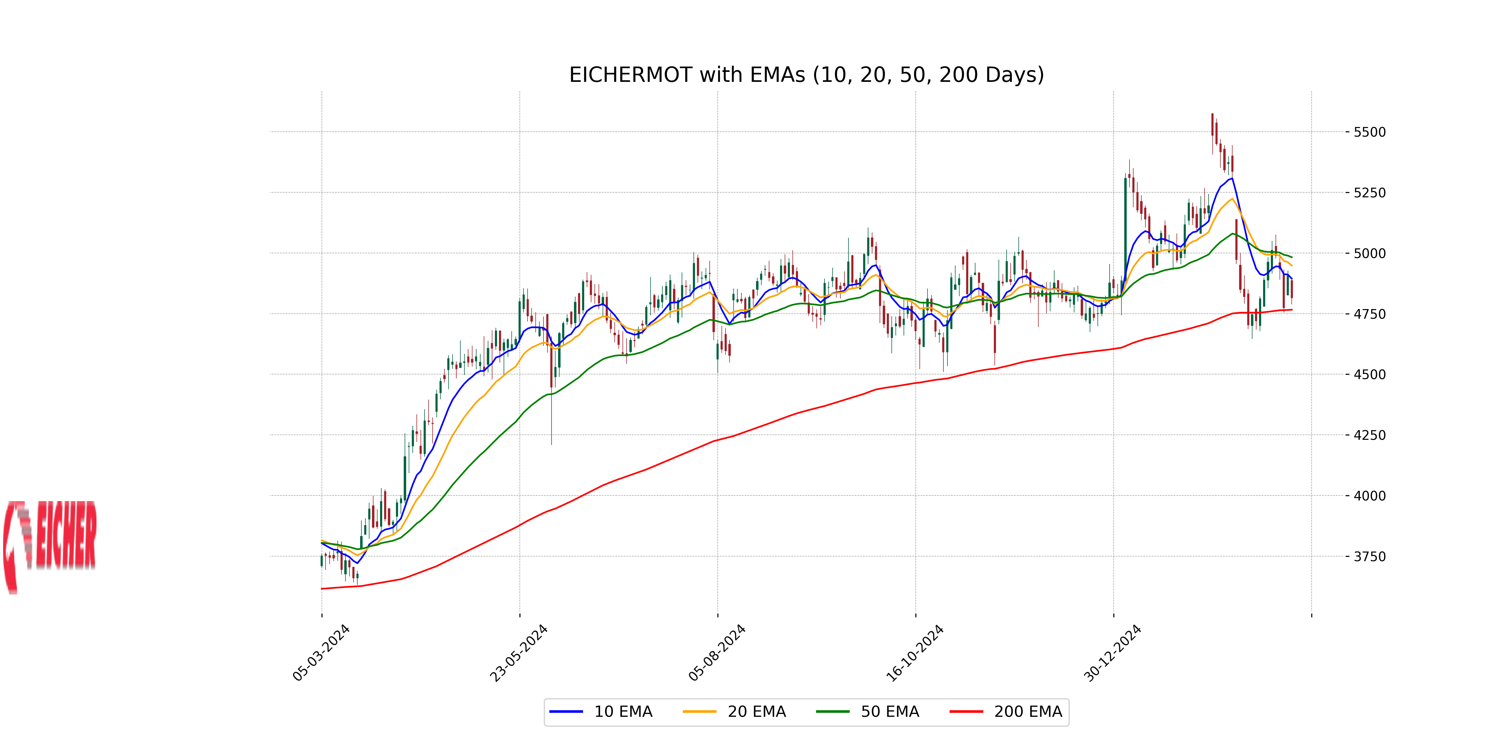 For Eicher Motors, the close price of 4815.10 is below the 50-day EMA of 4982.34 and the 10-day EMA of 4893.83, indicating short-term bearish momentum. However, it remains above the 200-day EMA of 4765.96, which suggests a potential support level in the longer-term trend.