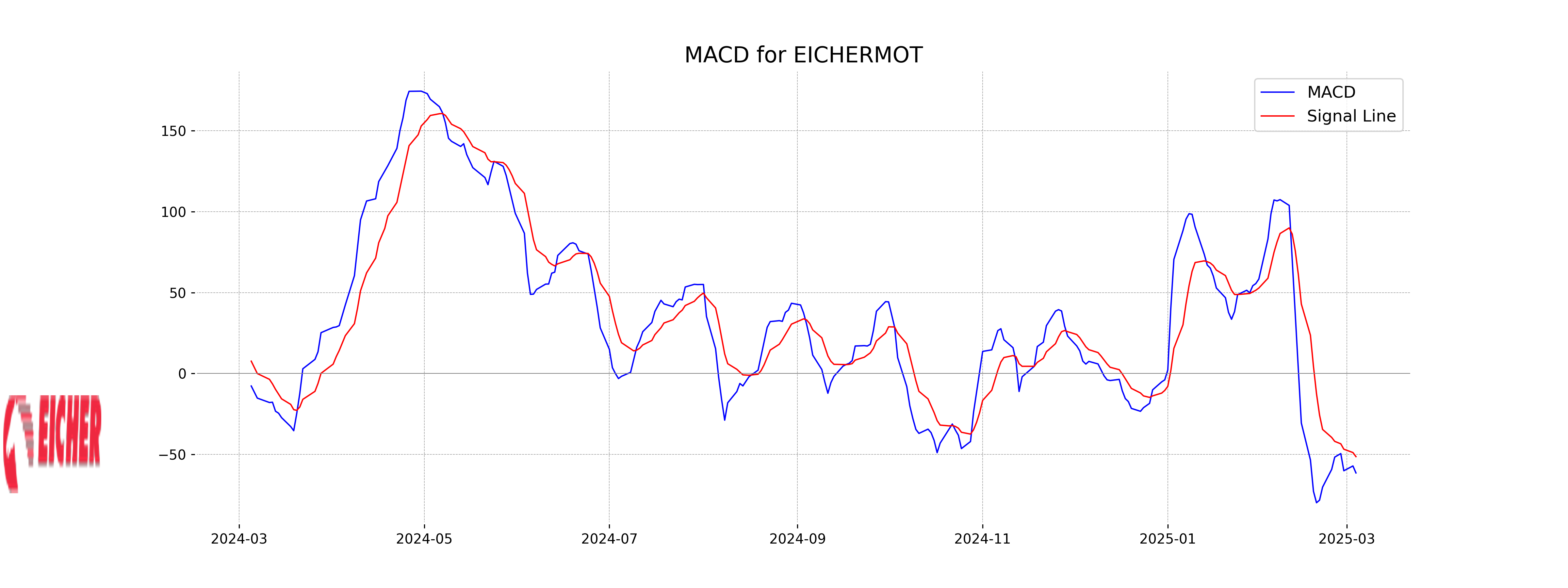 Eicher Motors exhibits a bearish trend as suggested by the MACD analysis. The MACD value of -61.43 is below the signal line of -51.34, indicating potential continued downward momentum. The negative MACD crossover suggests selling pressure in the short term.