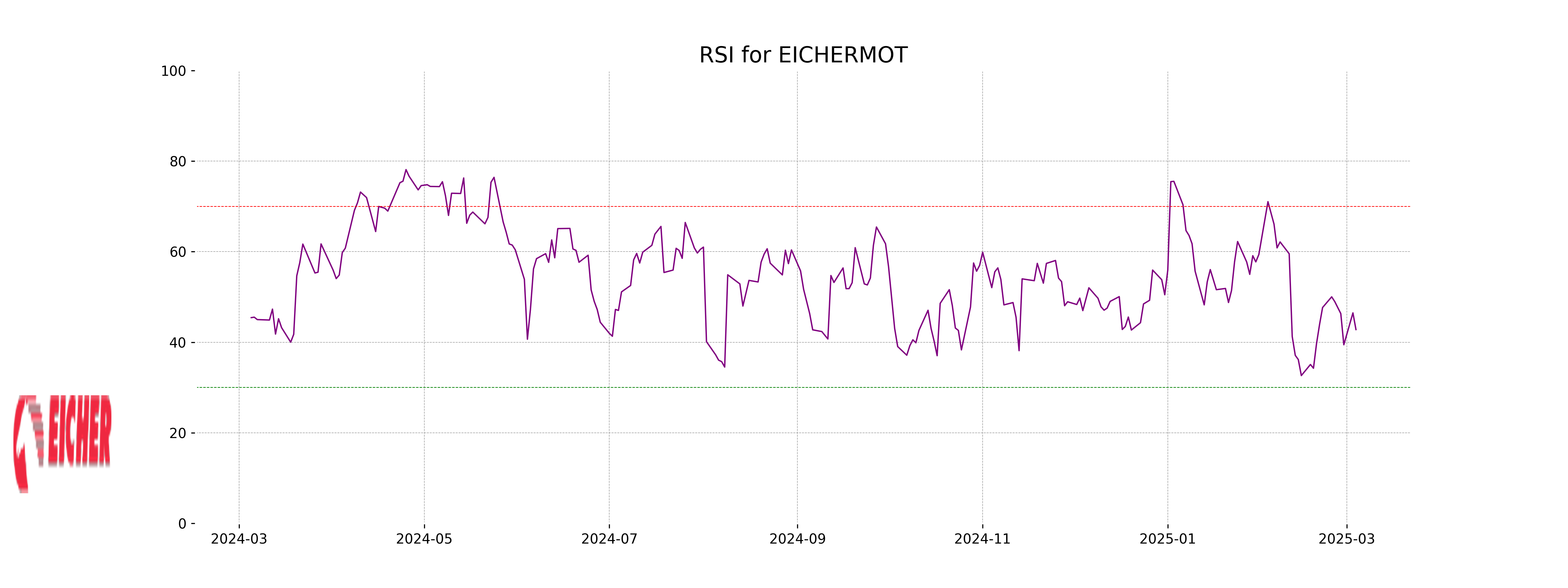 Eicher Motors' Relative Strength Index (RSI) is currently at 42.79, indicating that the stock is neither overbought nor oversold. This mid-range RSI suggests a balanced market sentiment, with no strong momentum in a particular direction. Traders may consider this as a signal of potential consolidation.