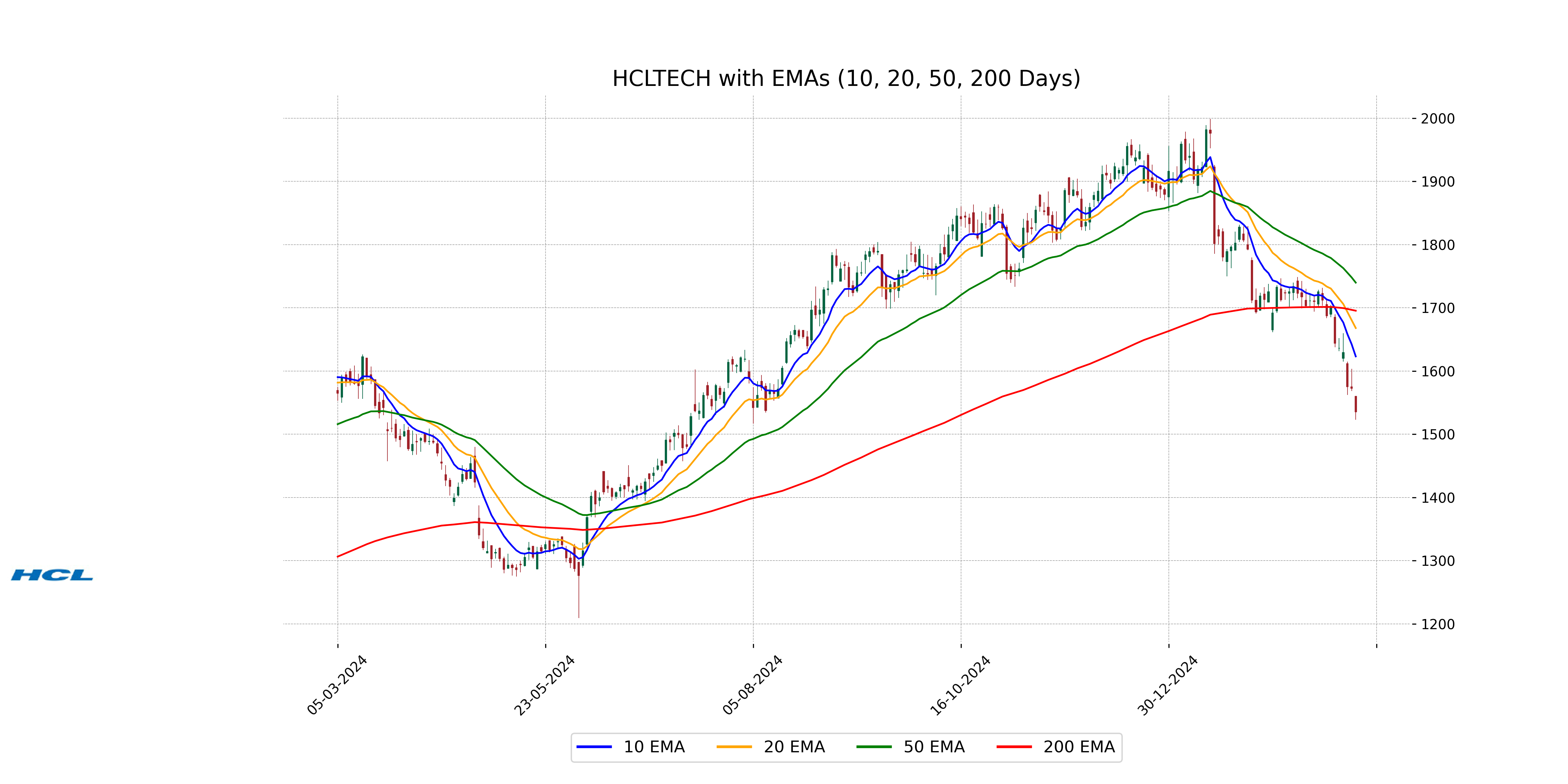 Relationship with Key Moving Averages for HCL Technologies: The stock price of HCL Technologies is currently trading below its 10-day EMA, 20-day EMA, 50-day EMA, and 200-day EMA, indicating a bearish momentum in the short to long term. The price being significantly lower than these key averages suggests a downward trend.