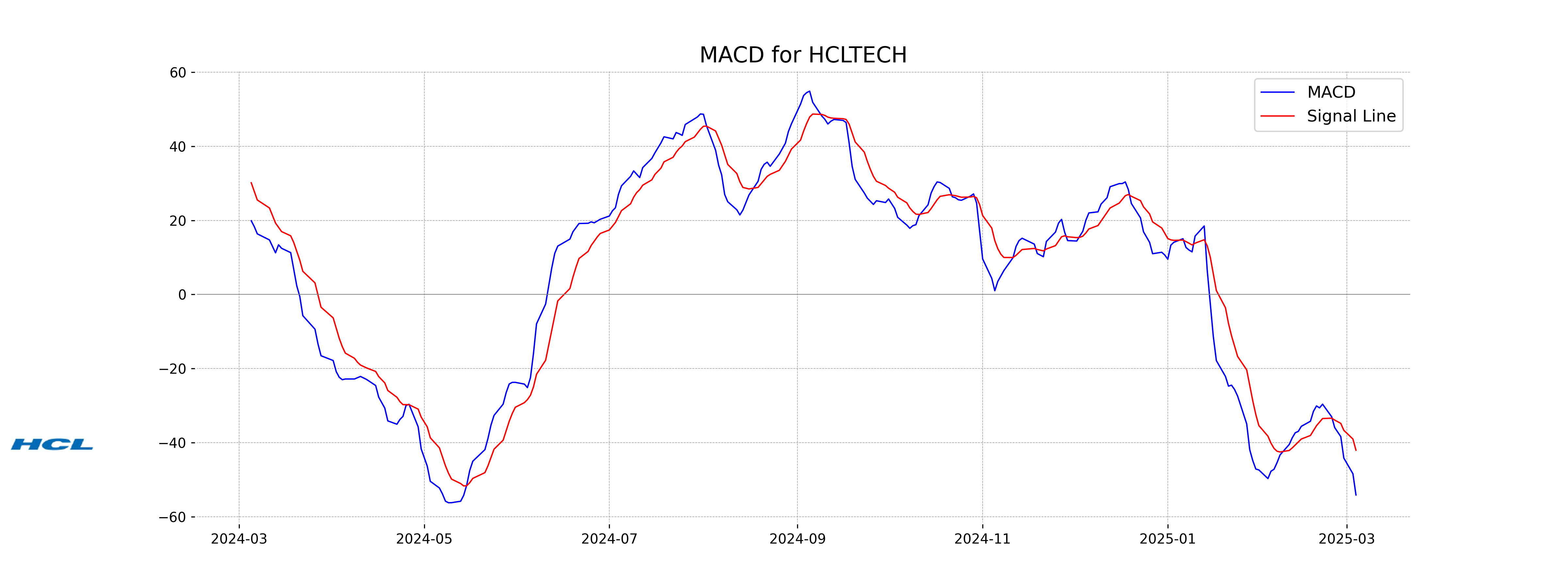 MACD Analysis for HCL Technologies: The MACD value of -54.11, which is below the MACD Signal value of -42.03, indicates a bearish trend for HCL Technologies. The negative divergence suggests a potential continuation of the downward momentum.