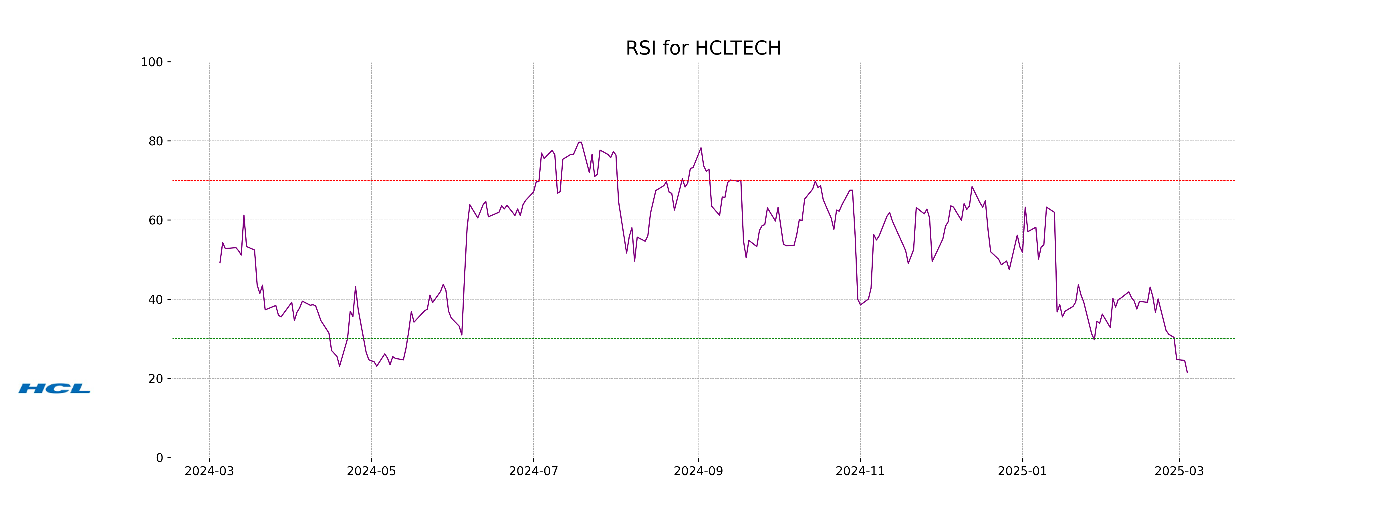 RSI Analysis for HCL Technologies: The current RSI for HCL Technologies is 21.43, which indicates that the stock is in the oversold territory. This suggests a potential buying opportunity as the stock may be undervalued at the moment.