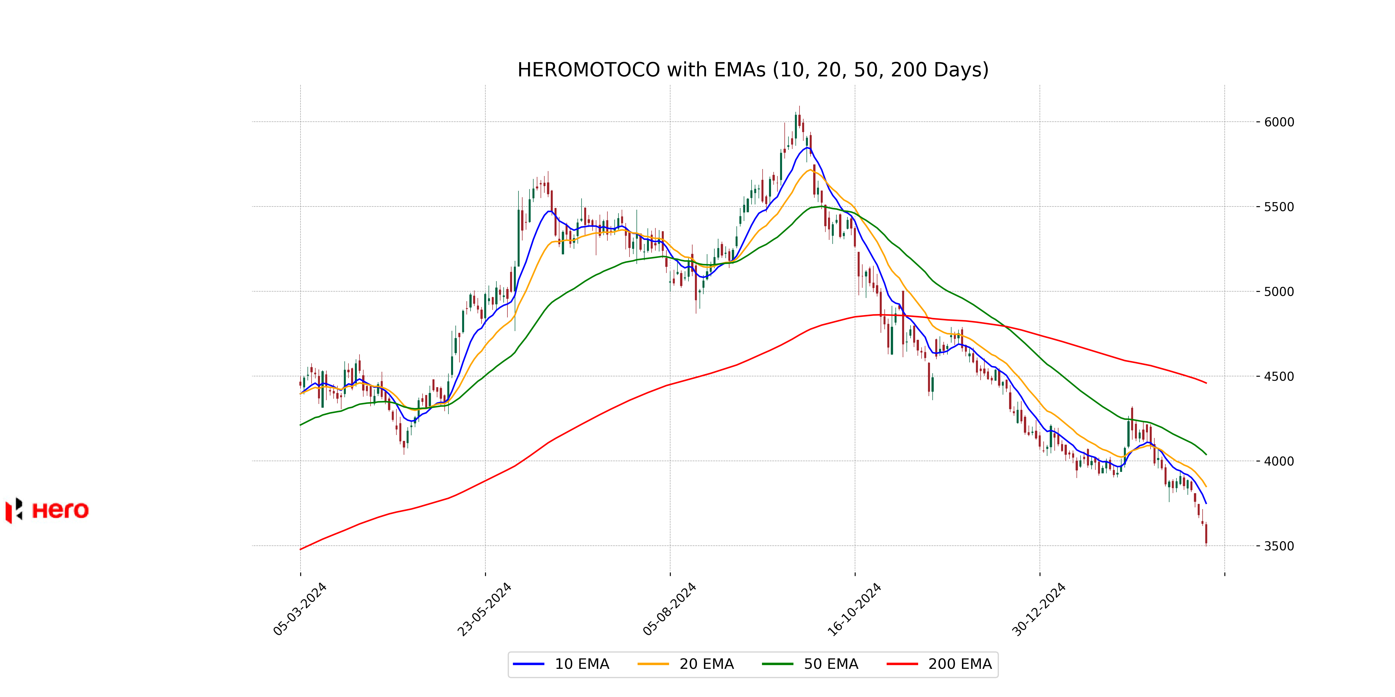 Hero MotoCorp is currently trading below its 10-day EMA (3749.99), 50-day EMA (4037.91), and 200-day EMA (4459.23), indicating a bearish trend in the short, medium, and long term. The stock's position below these key moving averages suggests potential downward momentum.