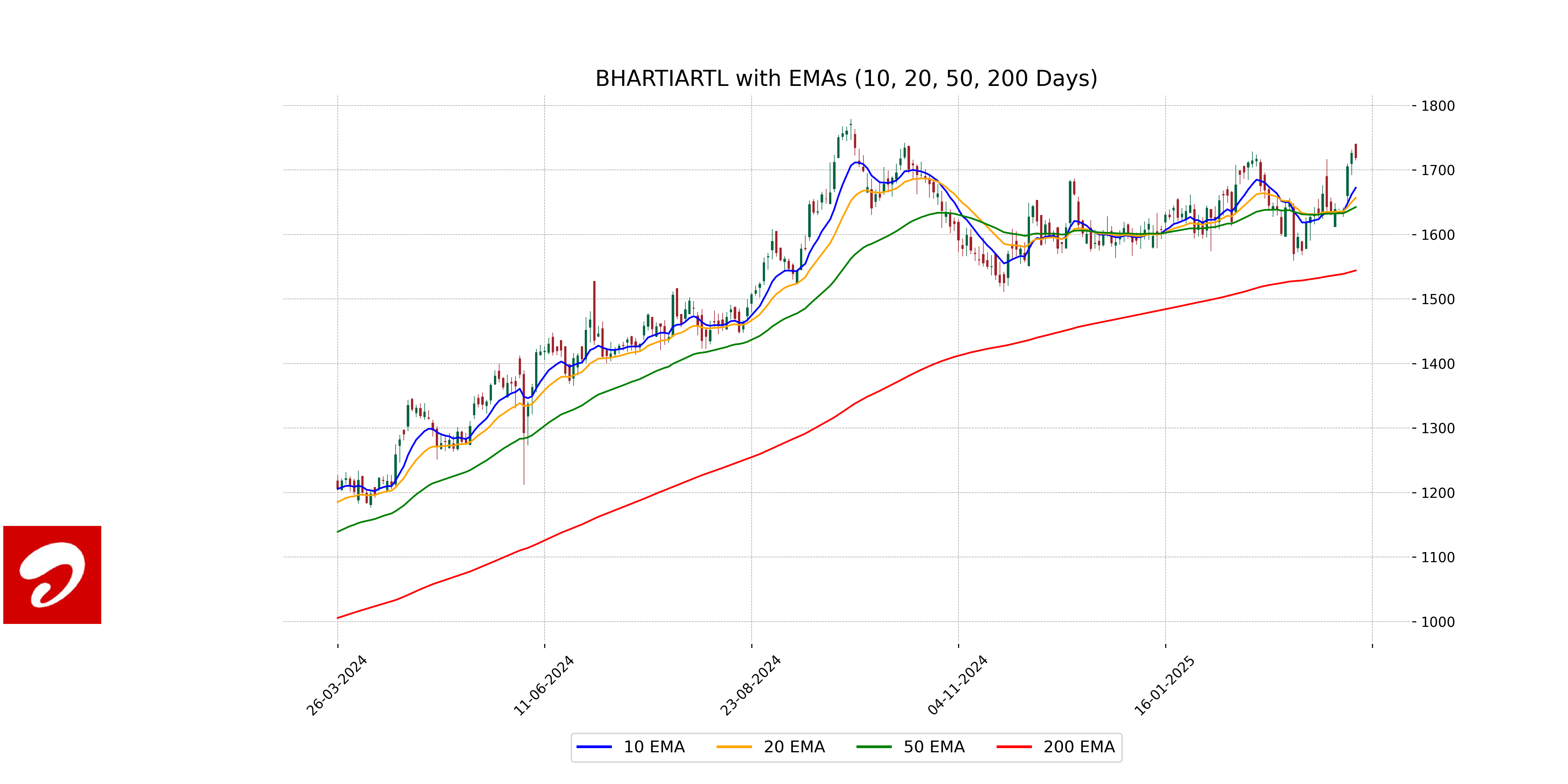 Based on the provided data for Bharti Airtel, the stock is trading above its 50-day EMA (1642.53) and 200-day EMA (1544.24), indicating a positive medium to long-term trend. However, the stock is below its 10-day EMA (1672.50) and 20-day EMA (1656.88), suggesting a recent pullback or consolidation in price.