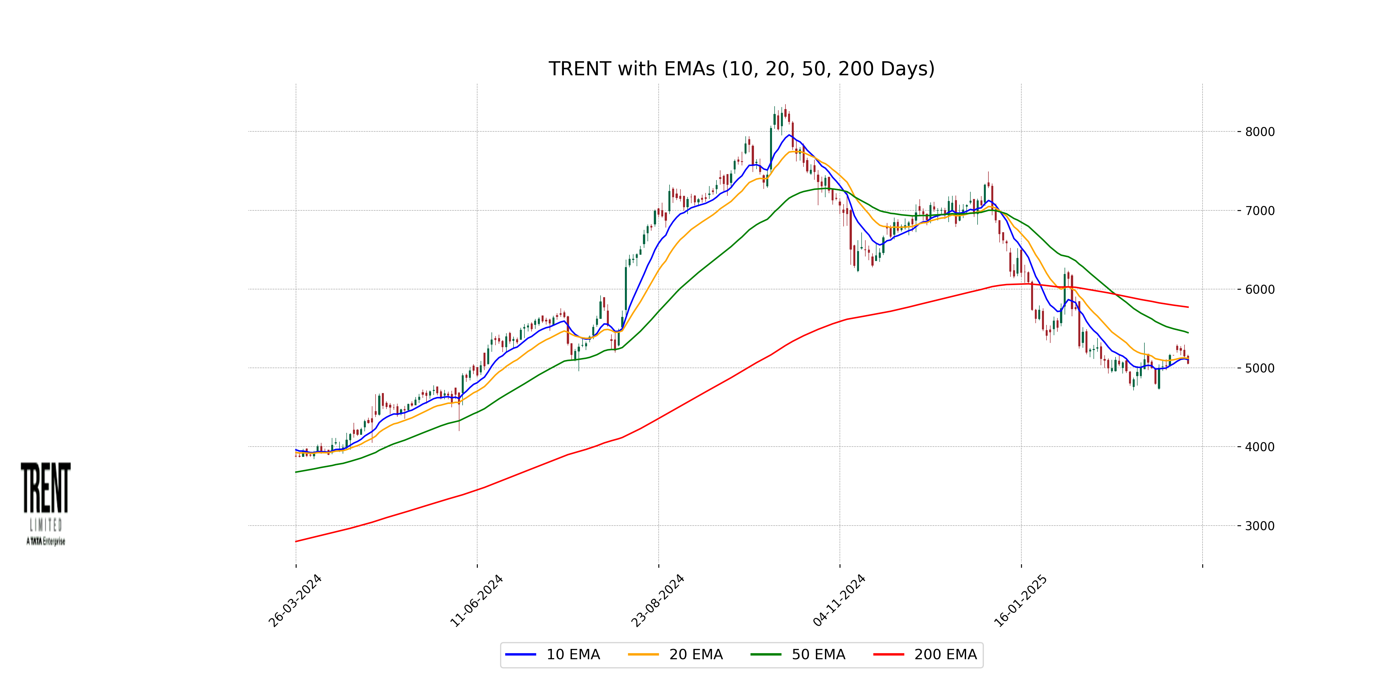 Trent's closing price of 5054.70 is below its 10-EMA of 5105.19, 20-EMA of 5120.16, 50-EMA of 5446.71, and 200-EMA of 5771.09, indicating a possible short-term downtrend. This suggests weakness as the price is trading below key moving averages.