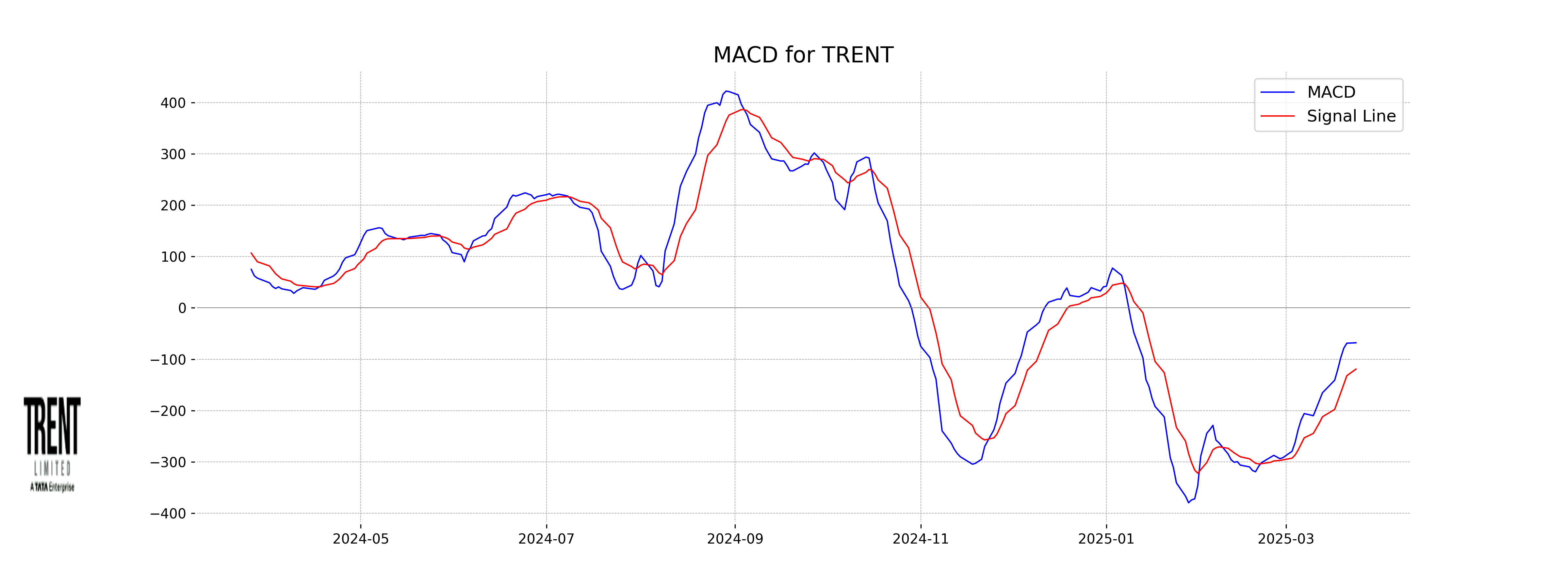 Based on the data for Trent, the MACD is at -67.98, which is less than the MACD Signal of -119.27, indicating a potential bullish signal as the MACD line is moving towards the signal line. However, since both values are negative, it suggests the stock might still be in a bearish territory and investors should be cautious.