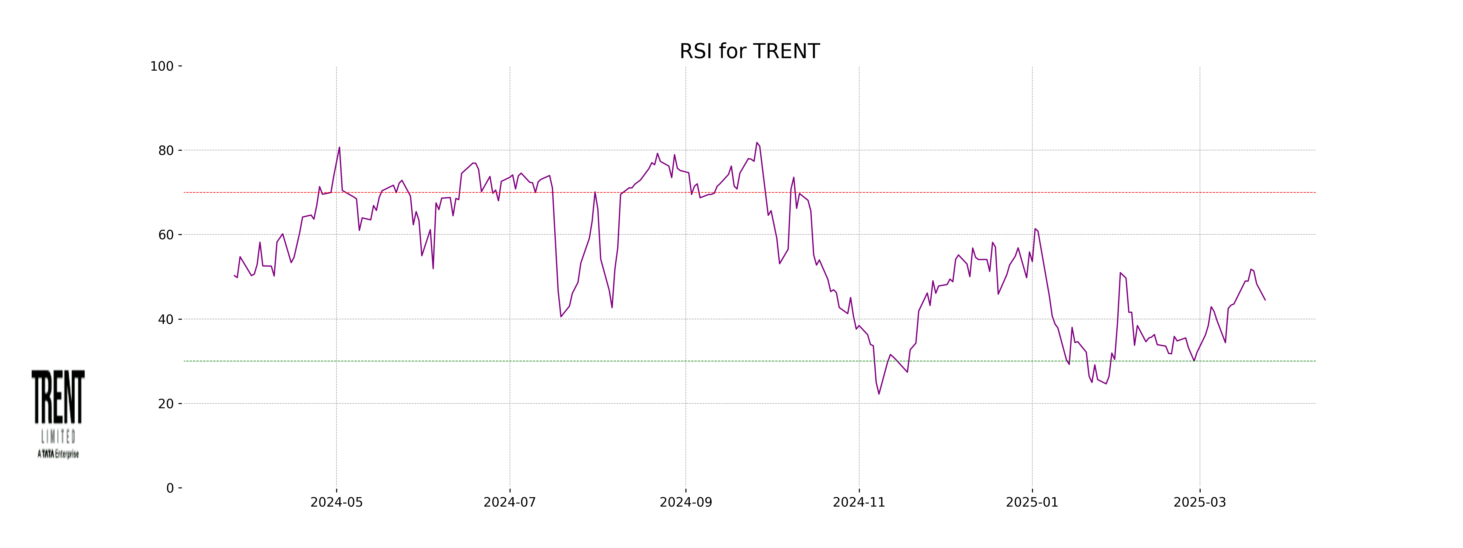 Trent's RSI is at 44.52, indicating that the stock is approaching the oversold territory, but it is not there yet. This suggests that the stock might be undervalued and could be due for a potential upside if buying pressure increases.