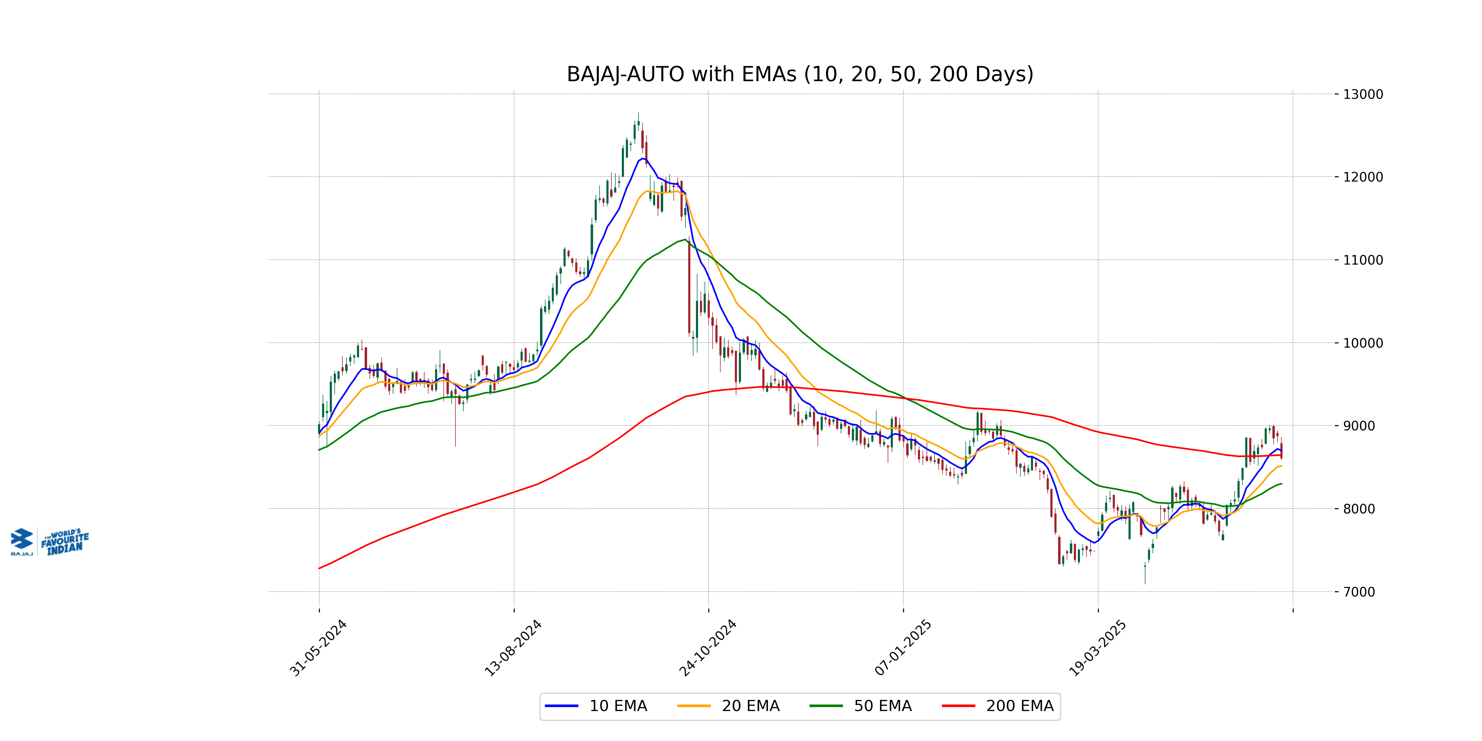 The closing price of Bajaj Auto is 8607.0, which is below the 200 EMA at 8642.71 but above the 50 EMA at 8298.74. It is also below the 10 EMA at 8699.02 but above the 20 EMA at 8512.30. This indicates mixed short-term and long-term trends.
