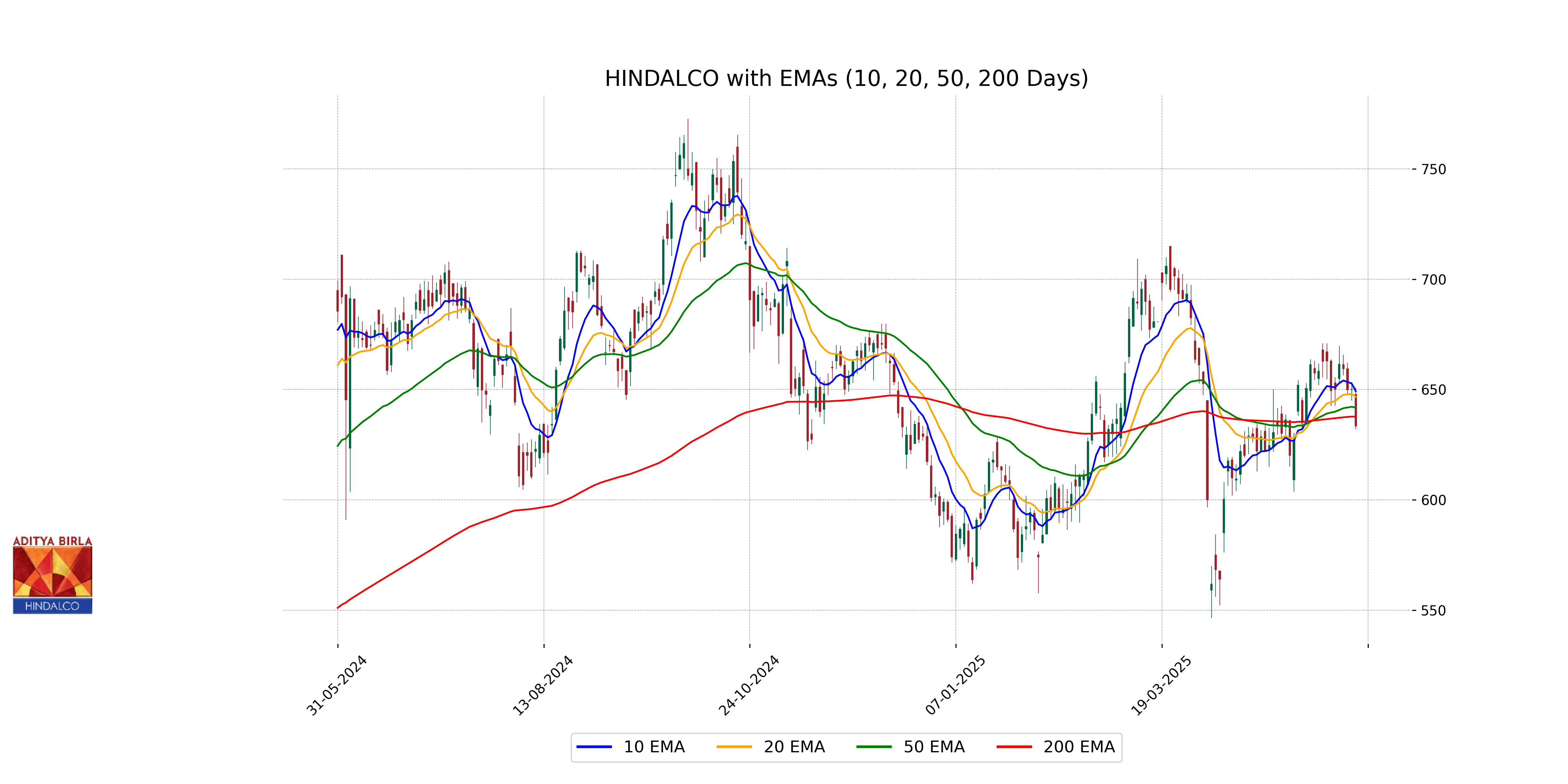 Hindalco's current close price of 633.5 is below its 10 EMA (649.24) and 20 EMA (646.67), indicating short-term bearish pressure. It is also slightly below the 50 EMA (641.85) but still higher than the 200 EMA (637.69), suggesting mixed sentiment with potential longer-term support.
