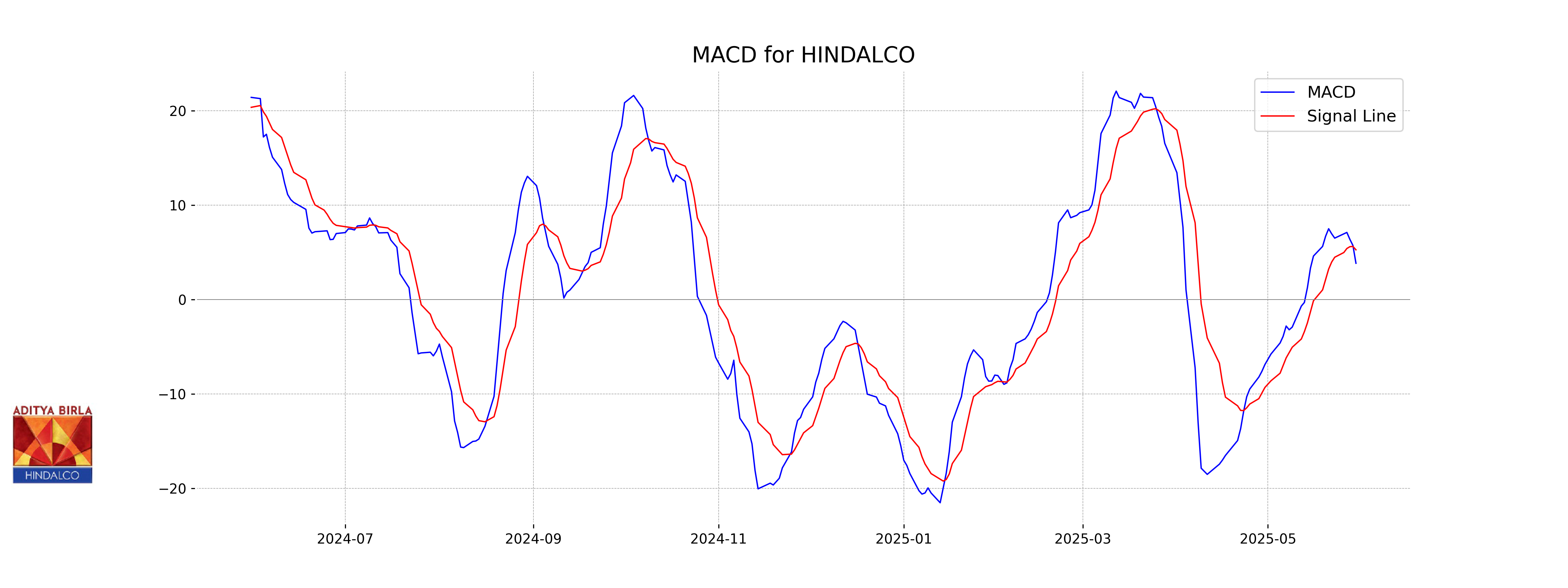 Hindalco: The MACD line for Hindalco is currently at 3.85, below the MACD Signal line at 5.28, indicating a bearish trend. This suggests potential downward momentum in the stock's price.