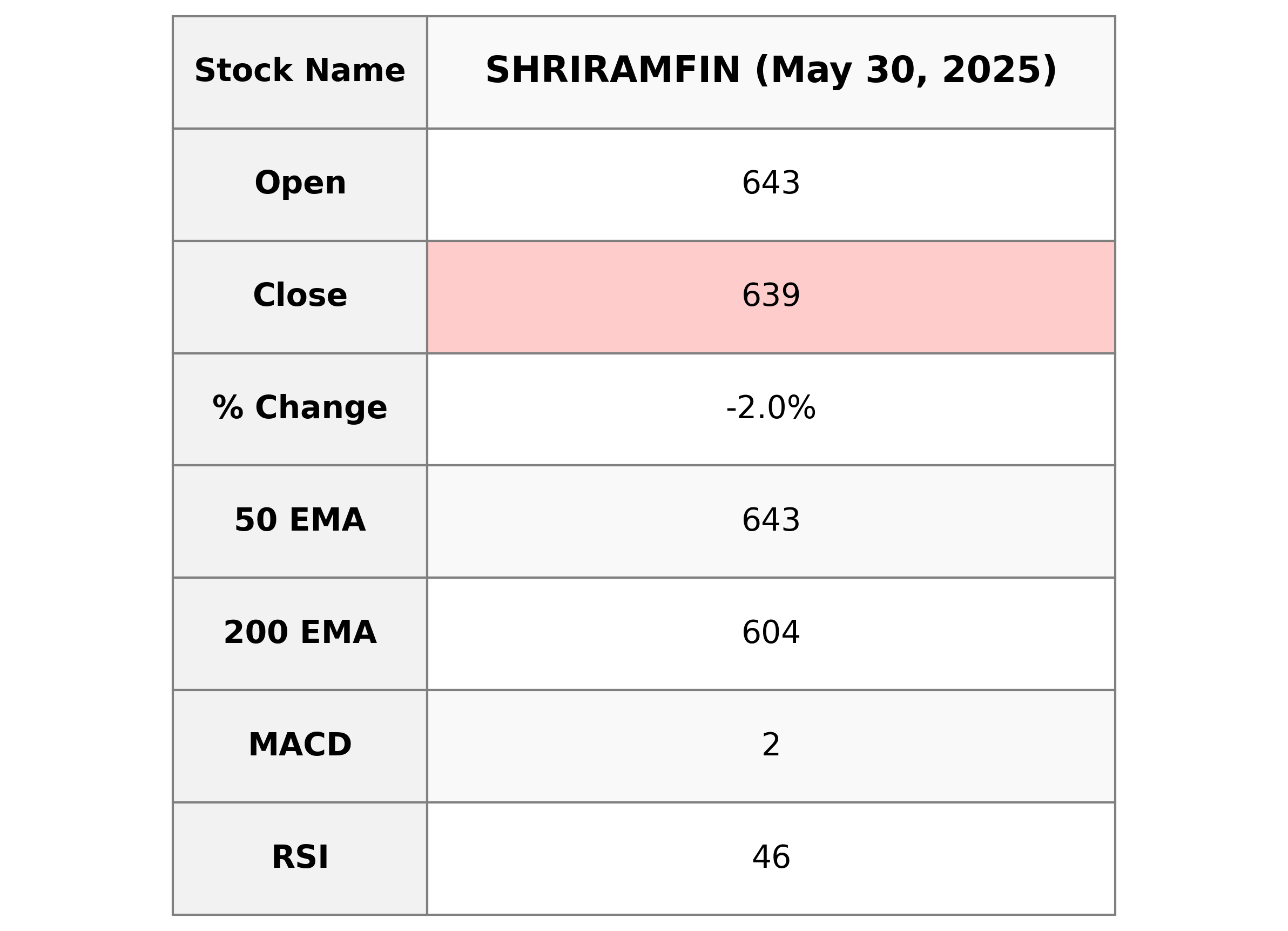 Stock Name: Shriram Finance Performance Summary: Shriram Finance opened at 643.10 and closed at 639.35, showing a decrease of approximately 1.98%. The stock's current performance is below its 10-day and 20-day EMA, indicating a short-term bearish trend, while its RSI of 46.38 suggests it is nearing the oversold territory. The PE Ratio stands at 12.76, reflective of its valuation within the financial services sector.