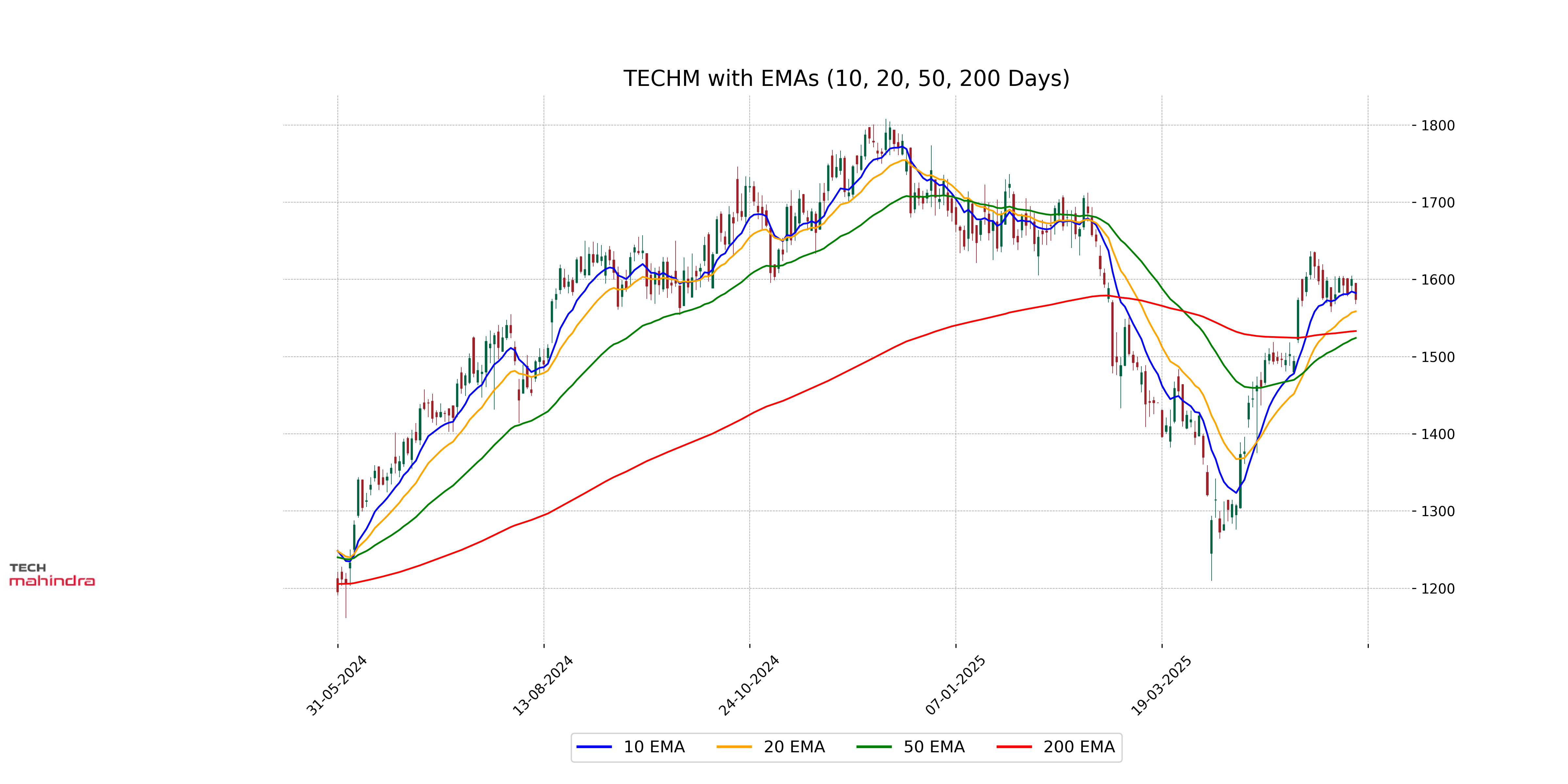 Tech Mahindra's closing price of 1573.90 is above its 50 EMA of 1524.14 and its 200 EMA of 1533.10 but below its 10 EMA of 1582.38. This suggests a short-term weakness as the price is below the 10 EMA while maintaining strength above the longer-term averages.