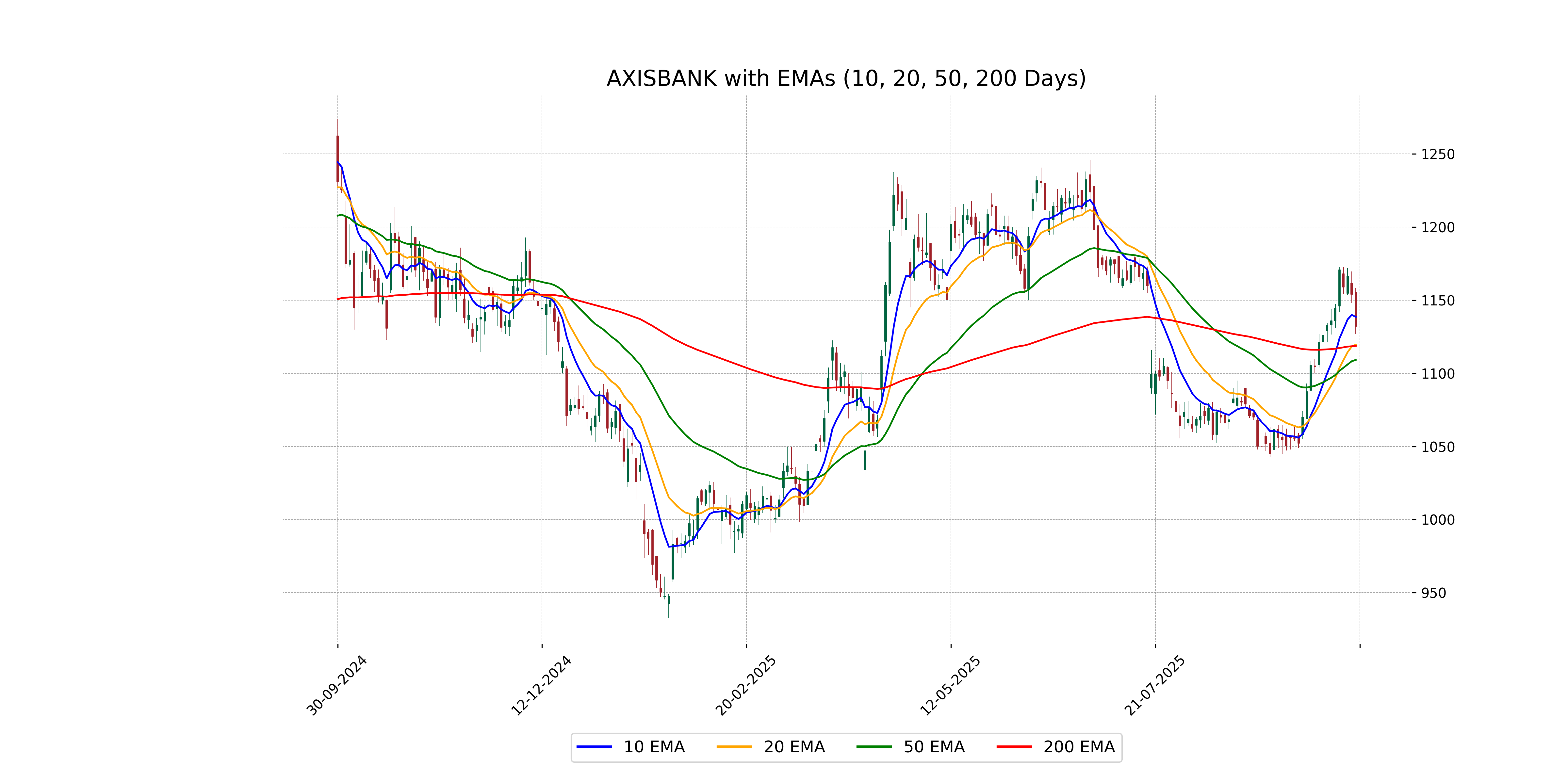 Axis Bank's stock closed at 1132.20, which is below its 10 EMA of 1138.56, suggesting potential short-term bearish trends, but it remains above the 50 EMA of 1109.19 and close to the 200 EMA of 1118.76, indicating overall supportive longer-term trends within the context of significant moving averages.