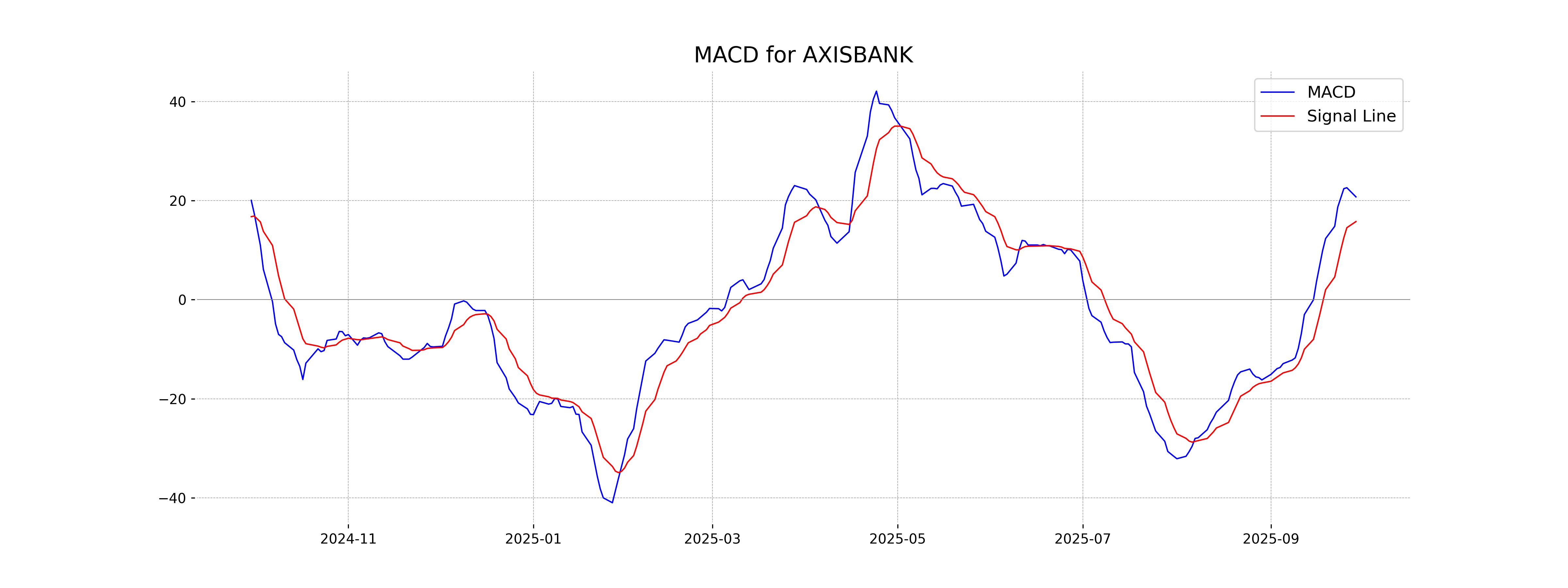 Axis Bank's MACD of 20.75 is above its MACD Signal line of 15.77, indicating a bullish trend. This suggests potential upward momentum in the stock's price. The RSI of 57.33 further supports this positive outlook, being in a neutral-to-bullish zone.