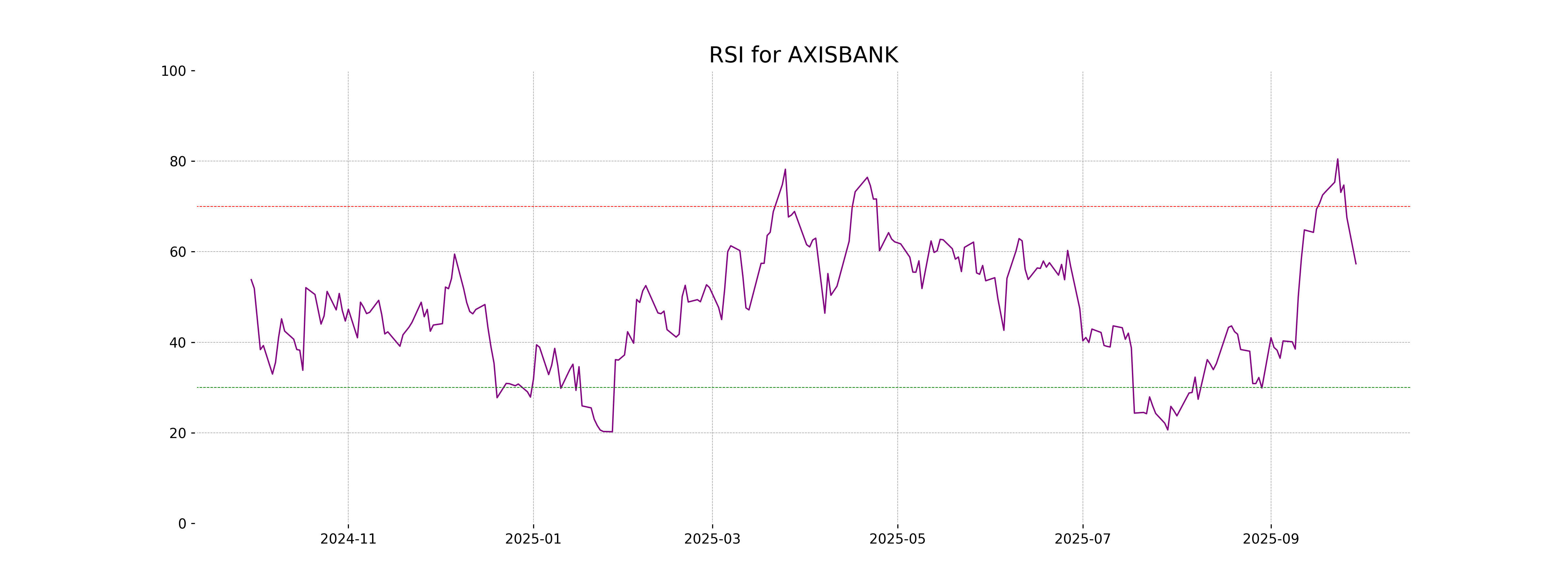 The Relative Strength Index (RSI) for Axis Bank is 57.33, indicating a neutral trend. An RSI value between 30 and 70 typically represents a stock that is neither overbought nor oversold. Therefore, Axis Bank is in a stable position with regard to its momentum, as reflected by its current RSI.