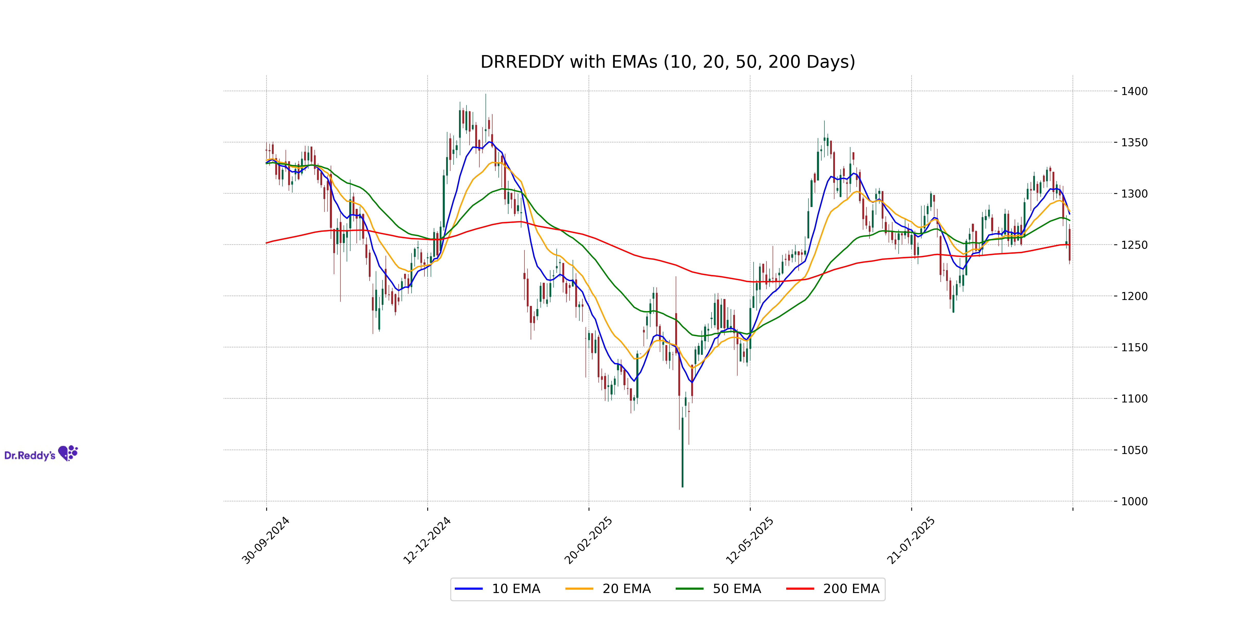 Dr Reddys Labs closed at 1234.60, which is below its 50 EMA (1273.67) and 10 EMA (1280.01) as well as its 20 EMA (1282.64), indicating a bearish trend. However, the close is slightly below its 200 EMA (1249.87), suggesting it is approaching long-term support levels.