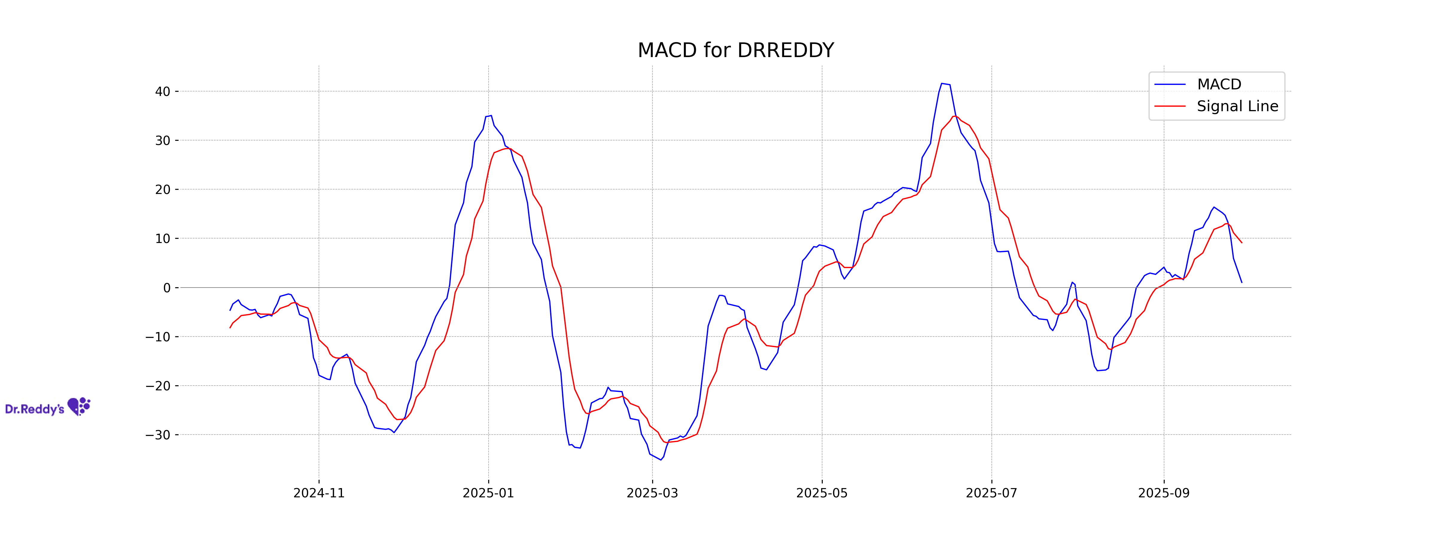Dr Reddys Labs' MACD of 1.03 indicates a slightly bullish sentiment, suggesting a potential upward momentum. However, with the MACD Signal line at 9.13, the stock might still be experiencing some bearish pressure. Caution is advised as the MACD is below the Signal line, traditionally a bearish indicator.