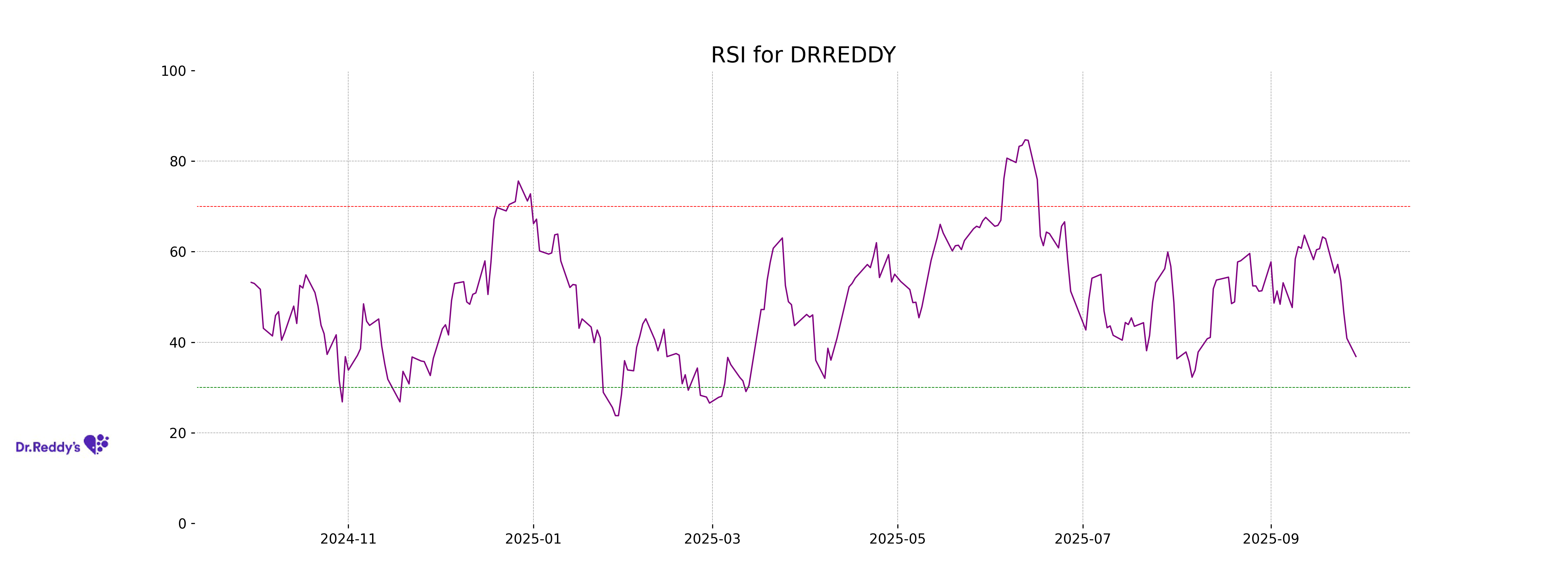 Dr Reddys Labs has a Relative Strength Index (RSI) of 36.85, indicating it is in the oversold territory. This suggests the stock may be undervalued and could present a buying opportunity for investors, but further analysis should be conducted to confirm.
