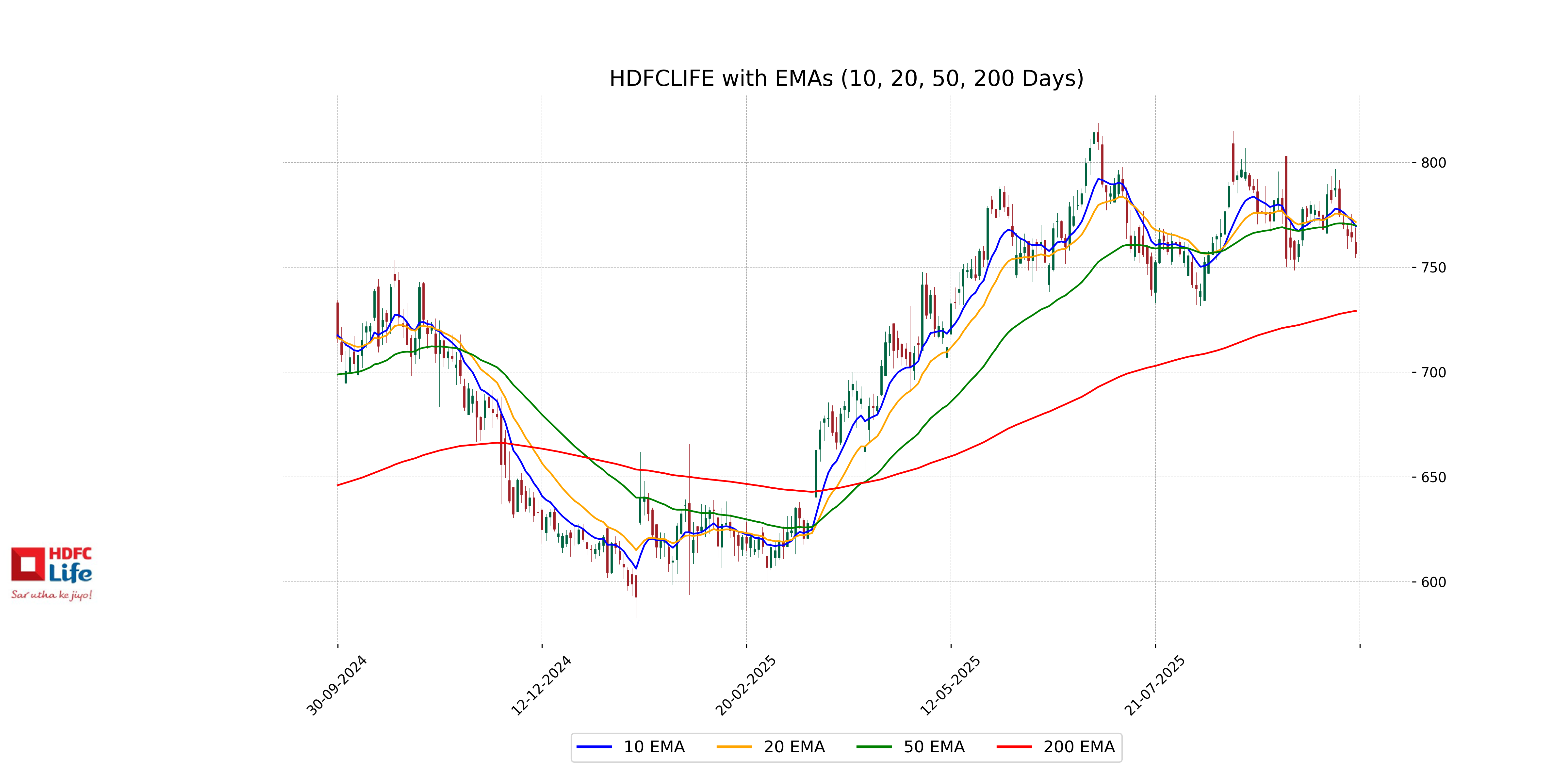 HDFC Life's current close price of 756.60 is below all major moving averages, including the 50 EMA at 769.91, 10 EMA at 769.50, and 20 EMA at 771.61, indicating a potential bearish trend. The difference from the moving averages suggests weakness relative to the recent averages, and with an RSI of 40.70, it may be approaching the oversold territory.