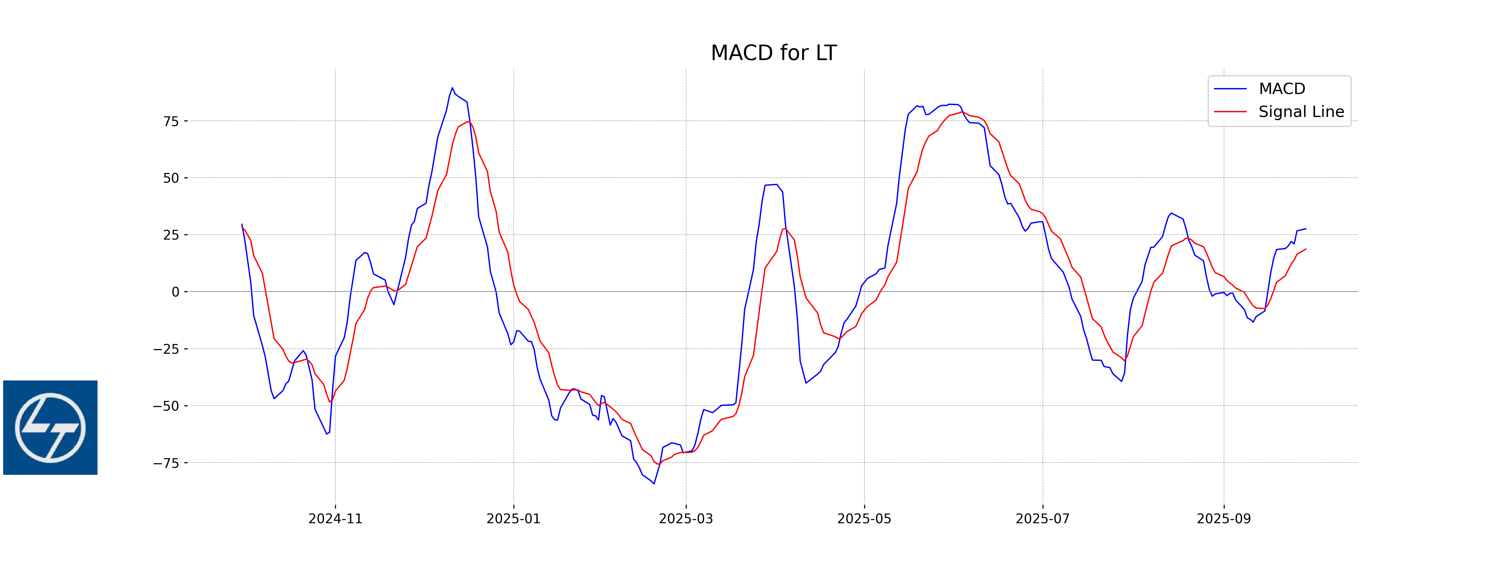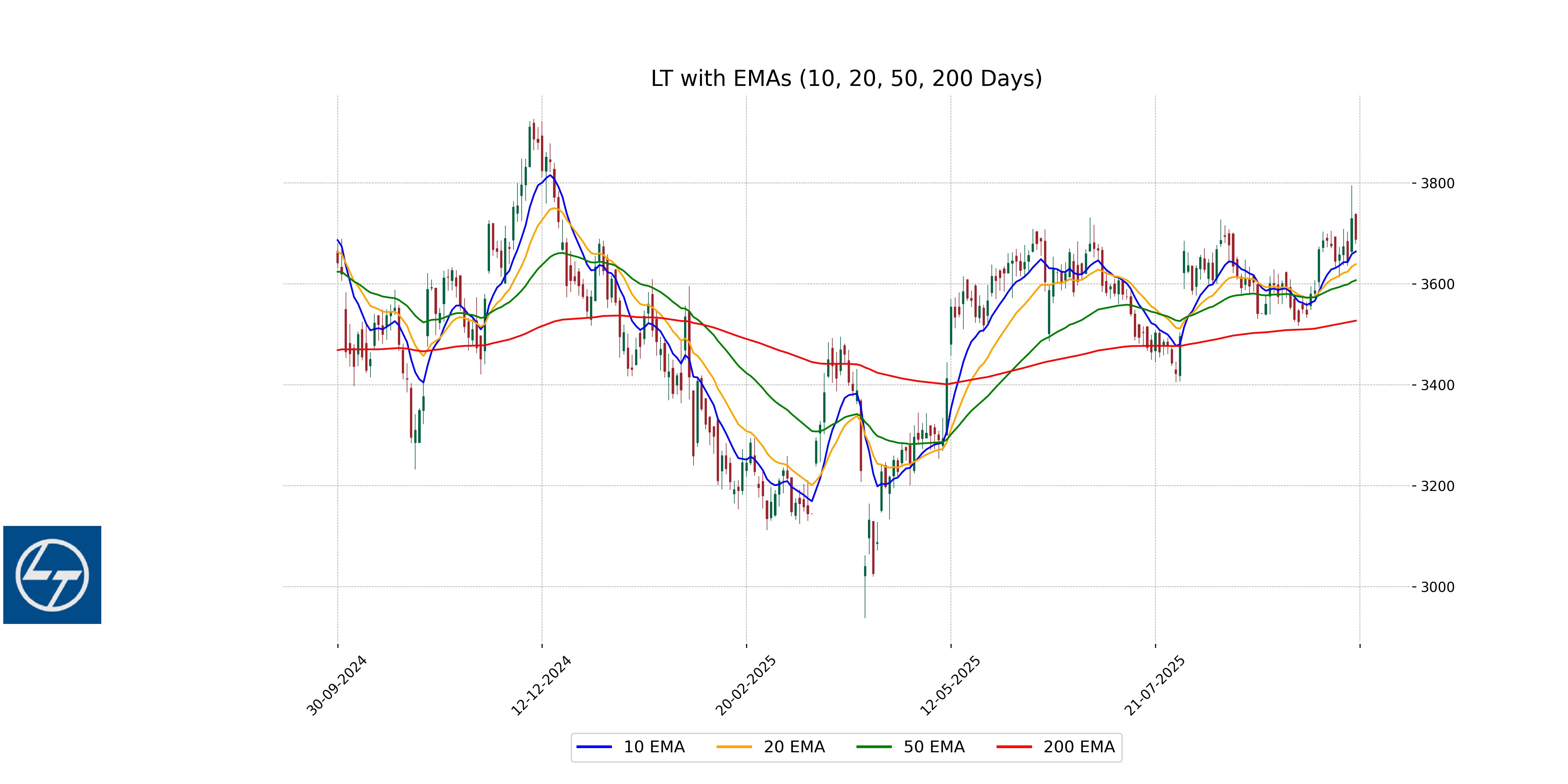 Based on the data provided, the closing price of Larsen & Toubro is currently below its 50-day and 200-day exponential moving averages (EMAs), suggesting potential downward momentum. However, it is trading above the 10-day and 20-day EMAs, indicating some short-term strength.