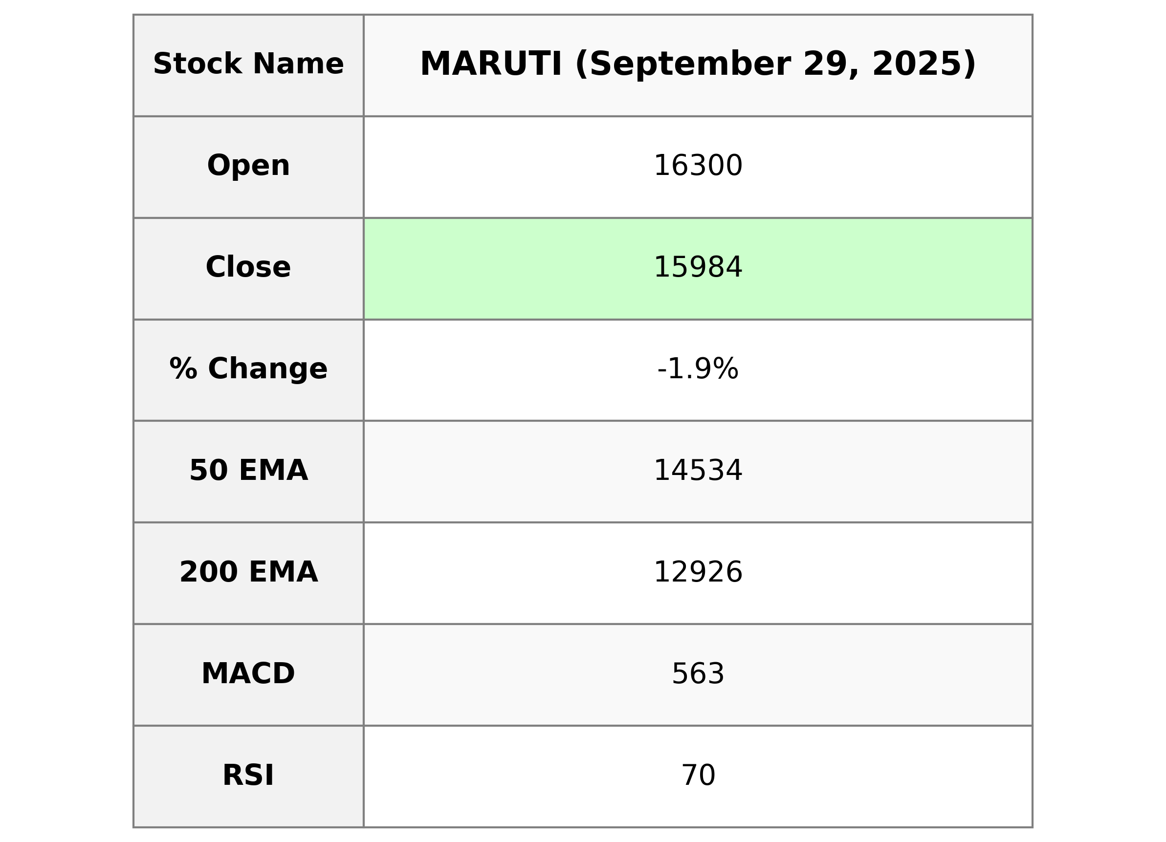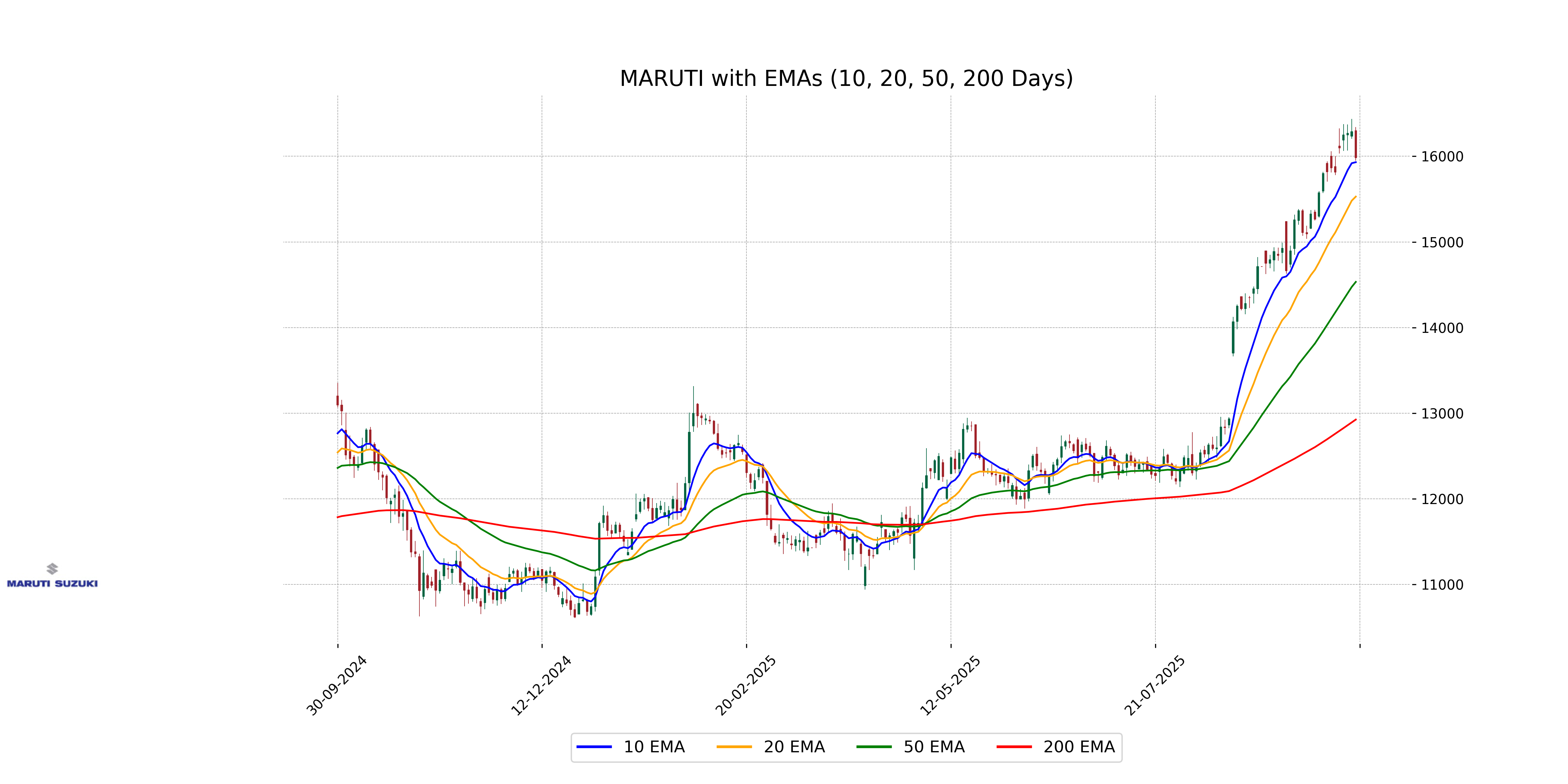 The current closing price of Maruti Suzuki at 15,984 is slightly above the 10 EMA of 15,931.02, indicating it traded close to its short-term moving average. It is significantly above the 50 EMA (14,533.61) and the 200 EMA (12,926.20), suggesting a strong bullish trend in the medium to long term relative to past data.
