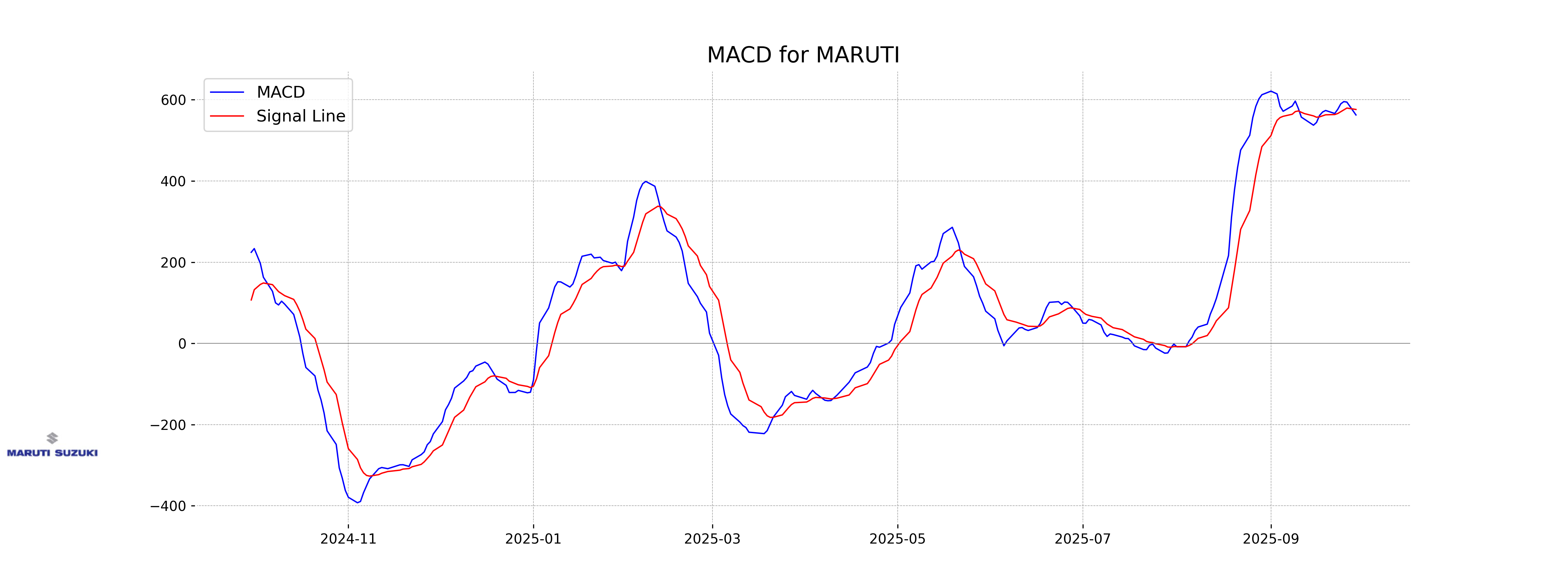 Maruti Suzuki MACD Analysis: The MACD for Maruti Suzuki is 562.58, while the MACD Signal is 576.14. This indicates a potential bearish trend, as the MACD line is below the MACD Signal line, which could suggest a possible weakening of the upward momentum.