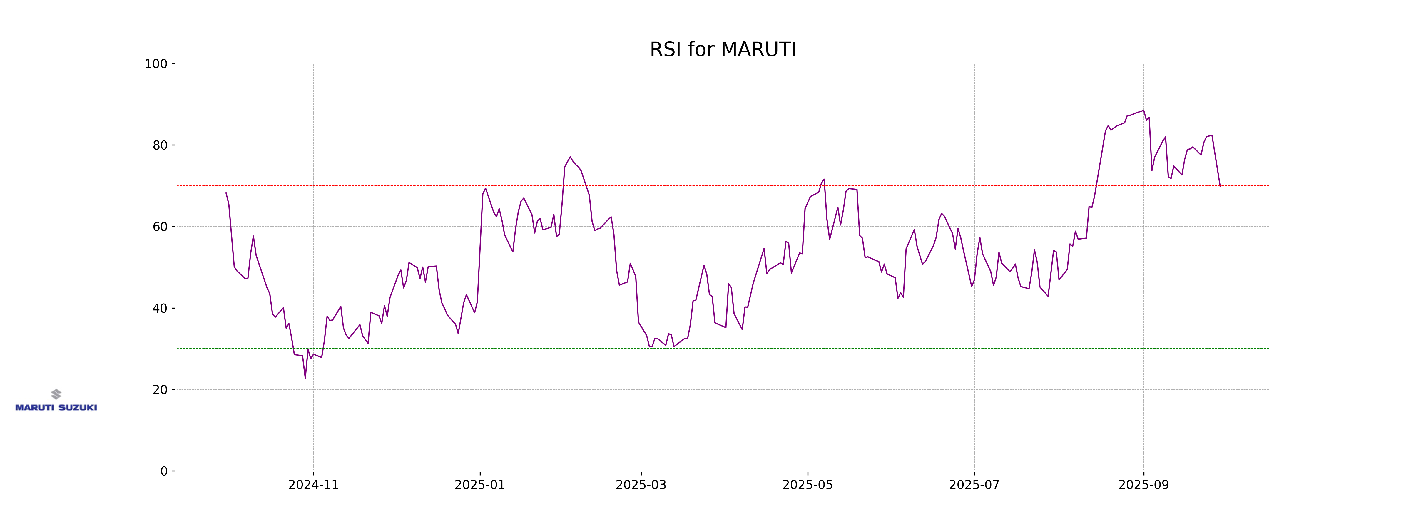 The RSI (Relative Strength Index) for Maruti Suzuki is at 69.84, which suggests that the stock is approaching overbought territory, as an RSI above 70 is typically considered overbought. Investors may want to monitor this level to determine if a price correction could be on the horizon.