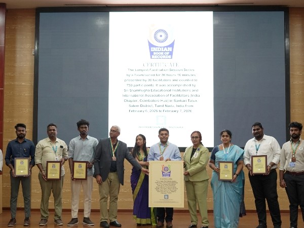 Salem (Tamil Nadu) [India], February 11: Sri Shanmugha Educational Institutions, in association with the International Association of Facilitators (IAF - India Chapter, Coimbatore Hub), successfully accomplished a world record in the category "Longest Series of Structured Facilitation Sessions Conducted by a Team" on 6th and 7th February 2026, certified by Elite World Records and the Indian Book of Records.