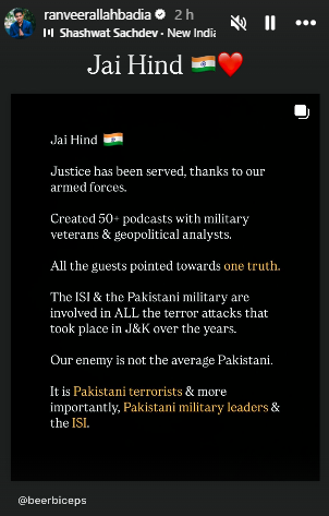 Justice has been served, thanks to our armed forces, said podcaster and influencer Ranveer Allahbadia on Instagram.