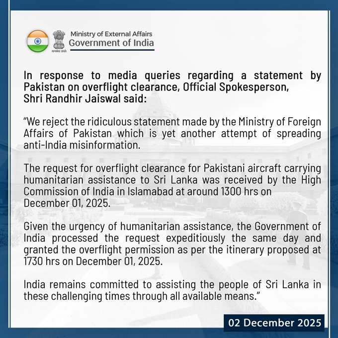 India rejects Pakistan's claim of blocking Sri Lanka relief flight as 'ridiculous'