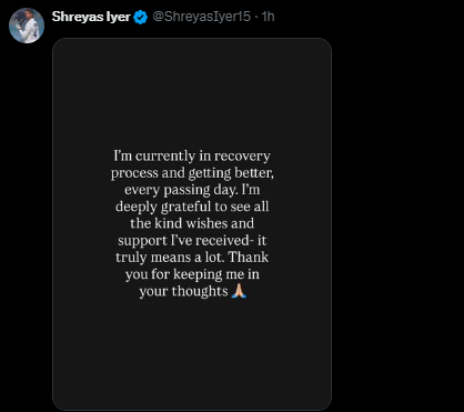'Getting better every day': Shreyas Iyer shares recovery update after serious rib injury